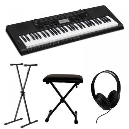 Pakken inkluderer Casiotone CT-S300-tastatur, keyboardstativ, hodetelefoner samt adapter og musikkstativ..