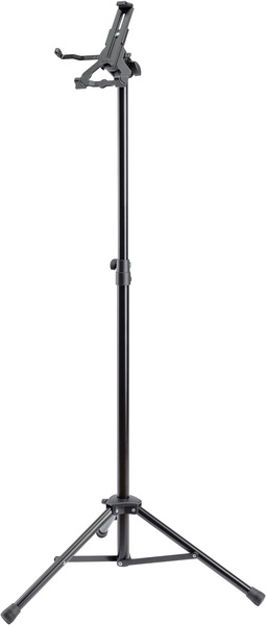 König & Meyer 19778 - Tablet PC Stand Pro »Biobased«Det robuste nettbrett-stativet fra K&M er spesialdesignet for profesjonell bruk, f.eks. i orkestergraven. Nettbrettfestet er laget av biobasert plast. Disse plastene inneholder en andel på over 50 % opptil 100 % fornybare plantebaserte råvarer. Bruk av fornybare råvarer bidrar til å bevare begrensede petroleumsressurser og redusere skadelige CO2-utslipp. Mer info om biobasert plast på: bioplastic.k-m.de. Holderens klemområde er mellom 158 og 280 mm. Holderen er også spesielt egnet for nettbrett med et beskyttende deksel eller etui opp til 18 mm tykkelse. De overlappende klembakkene med integrerte gummiputer gir et sikkert grep og eliminerer uønskede vibrasjonslyder. Funksjonen til betjeningselementene på enheten er ikke svekket. En justerbar monteringsbrakett med filtpolstring gir ekstra sikkerhet når nettbrettholderen er plassert vertikalt og forhindrer at nettbrettet faller ut selv ved hard bruk. Holderen kan svinges og vippes, slik at hver bruker kan plassere den individuelt. Svingbevegelsen kan justeres fra lett til tøff via en klemskrue. Nettbrettholderen kan roteres mellom stående og liggende format uten videre, slik at uavhengig dreining forhindres. De tre sammenleggbare føttene med en fotavtrykksdiameter på 700 mm gir høy grad av stabilitet med en liten pakningsstørrelse. Den uttrekkbare stangkombinasjonen gjør at stativet kan nå en høyde på 890 mm til 1550 mm.