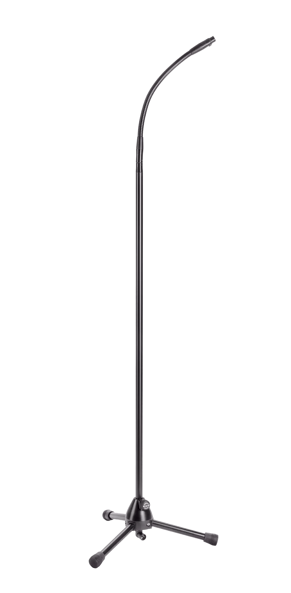 Stativet er pulverlakkert i sort og har robuste, korte helmetallføtter med støydempende gummikapper som gir høy stabilitet og plassbesparende plassering. Føttene kan foldes sammen for enkel transport. Med svanehals montert kan høyden utvides for fleksibel mikrofonplassering.