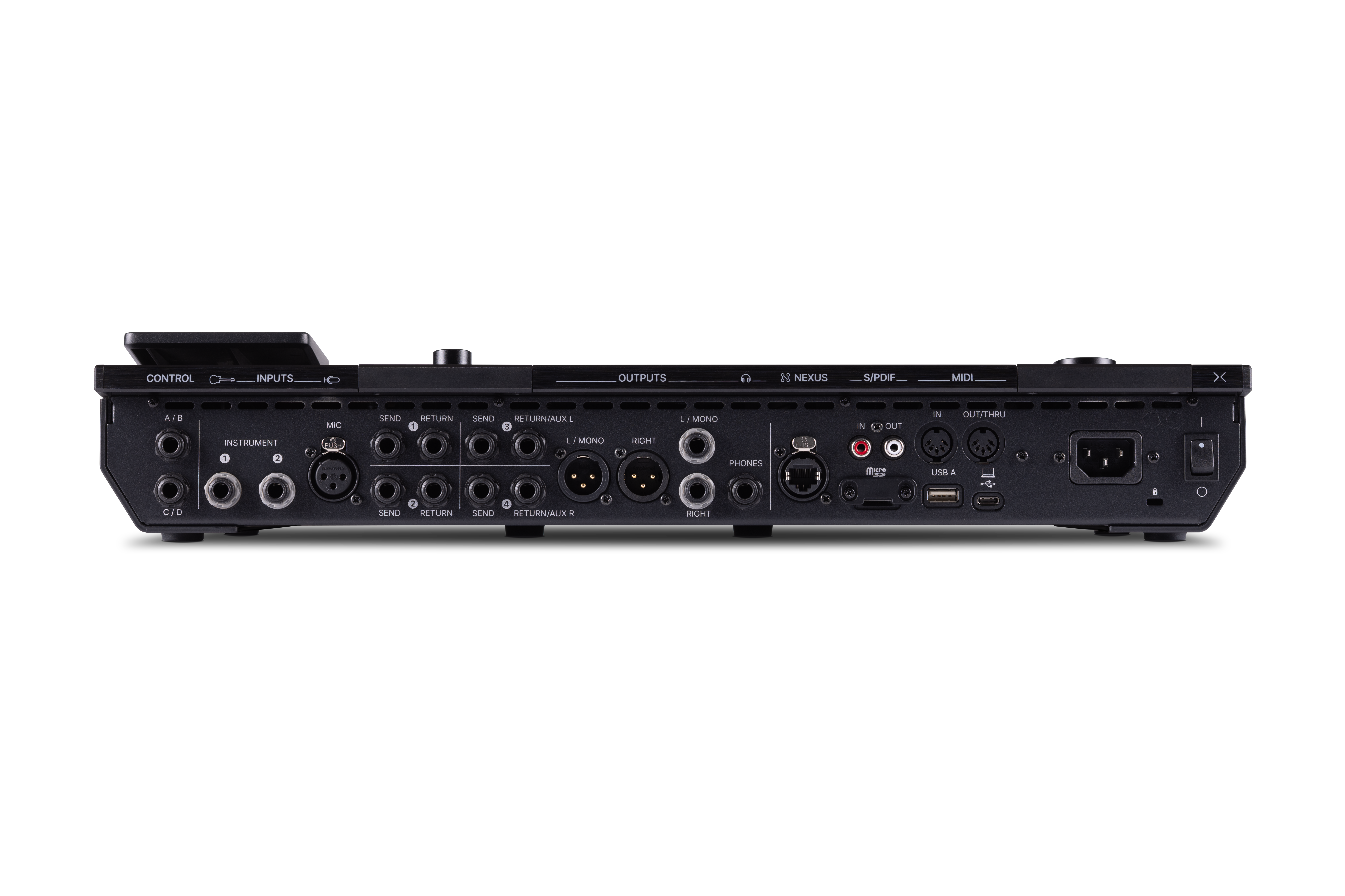 - Bred tilkobling: to instrumentinnganger, mikrofoninngang, XLR og 1/4"" utganger, hodetelefonutgang, fire send/return-jacks, S/PDIF, MIDI (DIN og USB), USB A-port og Nexus-port