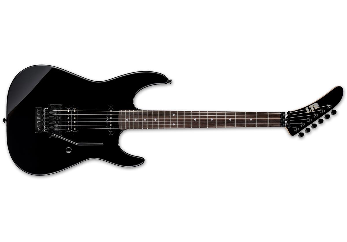Maskinvaren er gjennomført i sort og inkluderer en Floyd Rose Special dobbel-låsende tremolo, som gir stabil stemming og mulighet for omfattende vibrato-teknikker. Stemmeskruene er fra LTD og bidrar til pålitelig ytelse både på scene og i øvingsrom.