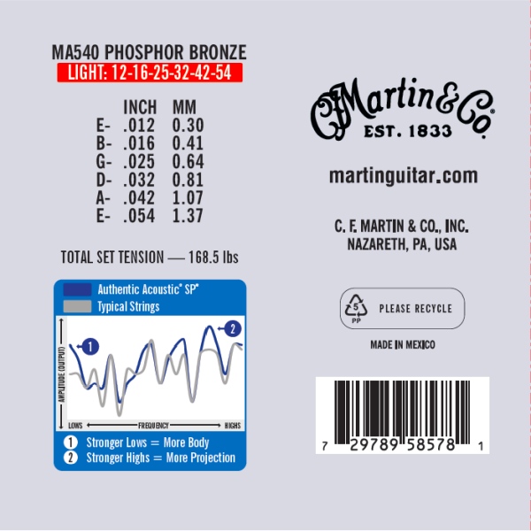 Authentic Acoustic-serien er nøye utformet med lyd, levetid og spillbarhet som de tre prioriteringene til utviklerne hos Martin Guitar.Akkurat som i gitarene sine, har de her brukt råvarer av absolutt topp kvalitet, og produksjonen er også av samme nitidige presisjon.For en så sterk strekkfasthet er det brukt en tinnbelagt kjerne på de spunnede trådene. Dette øker strengens motstand mot korrosjon og lar den opprettholde lyden og tonen lenger, uten å bli behandlet med noen form for belegg.