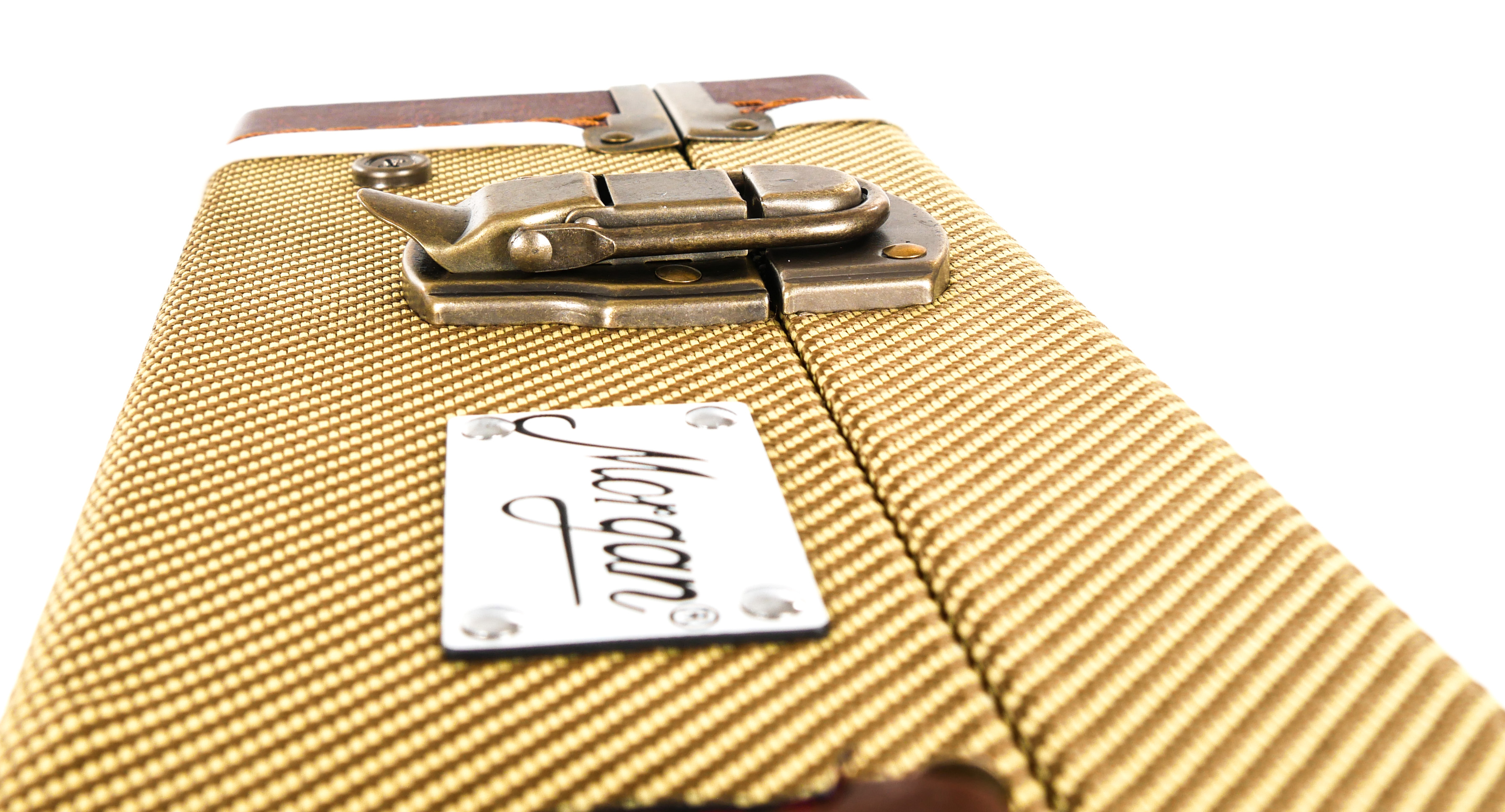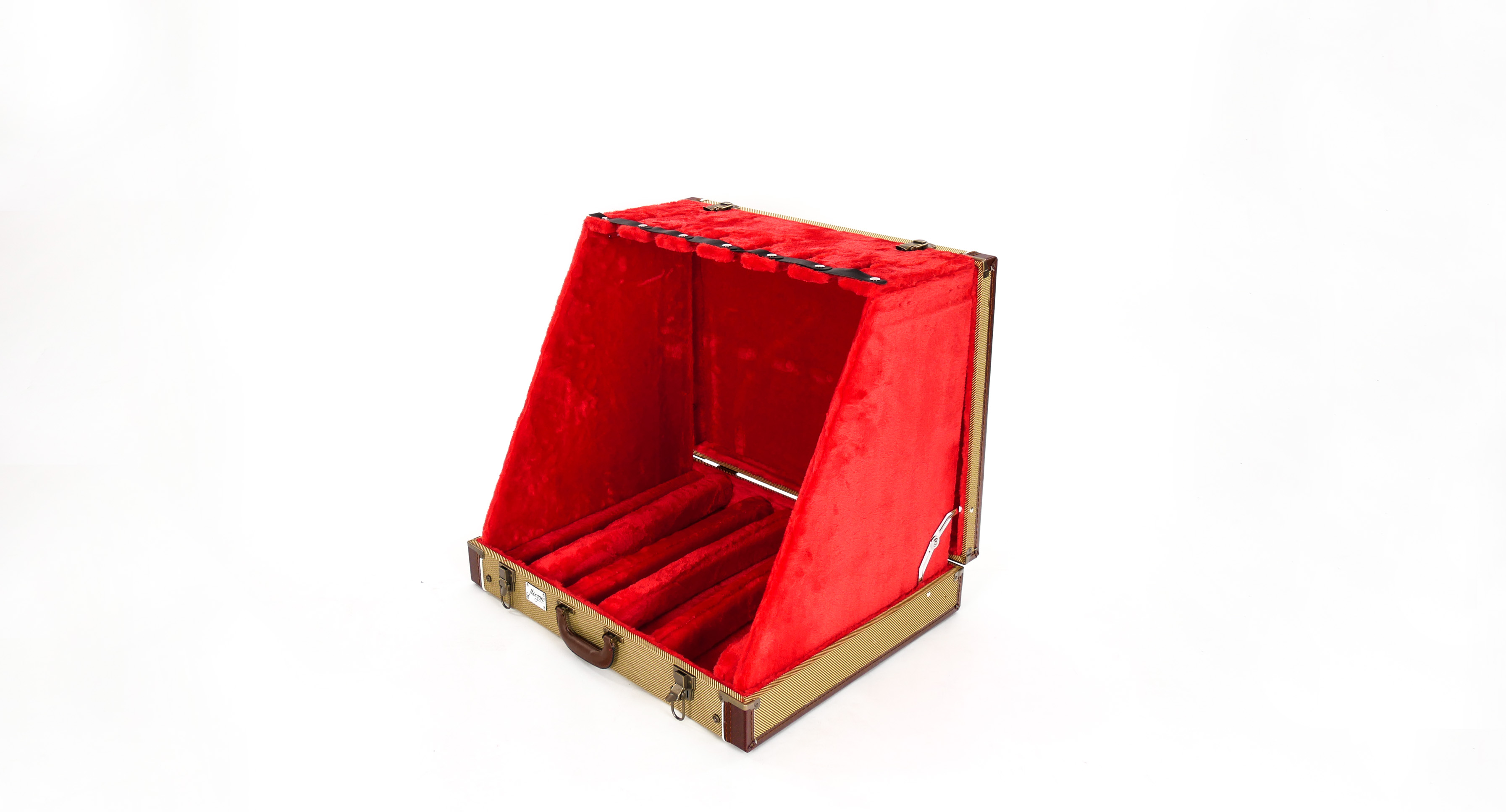 Høykvalitets Gitarstativ i koffertformat for 6 gitarer Farge: tweed Materiale: Vinyltrukket trefiner Rød plysj