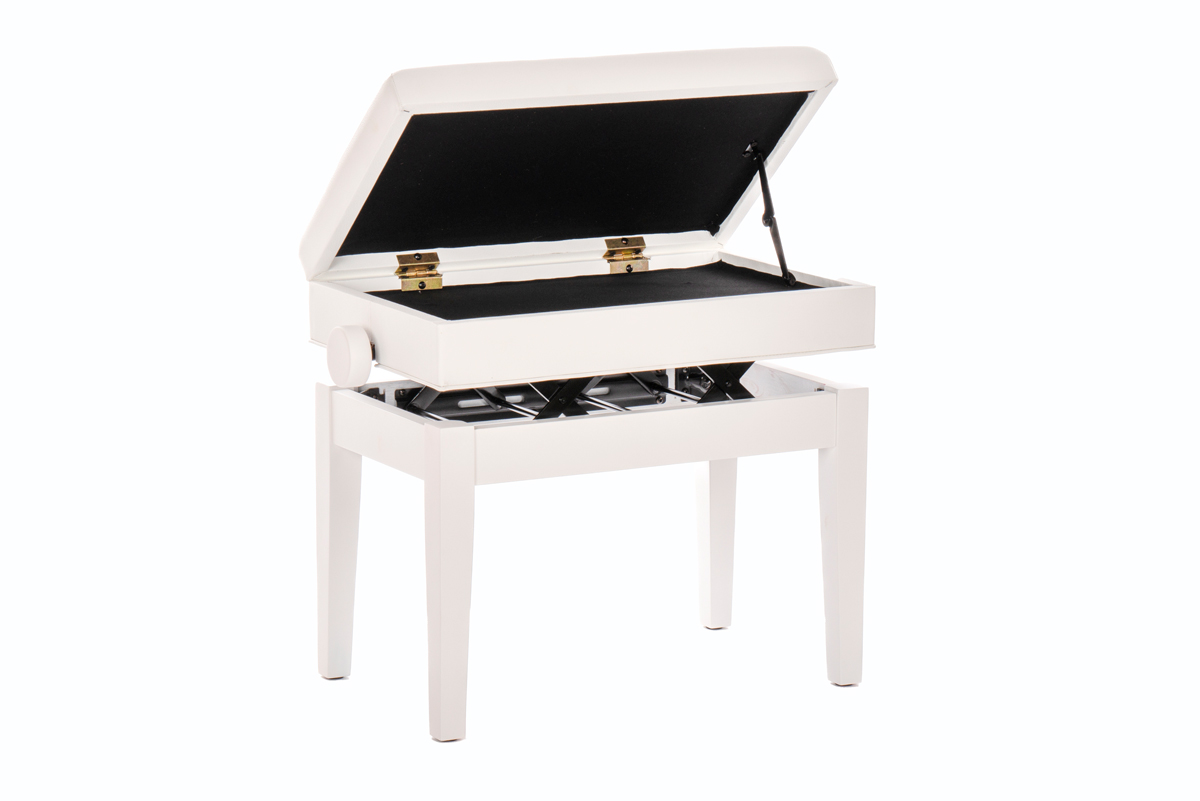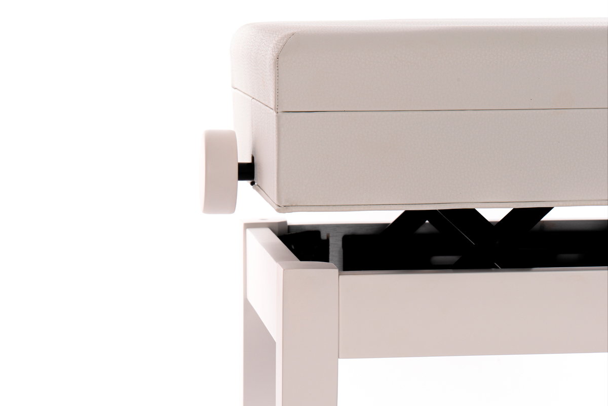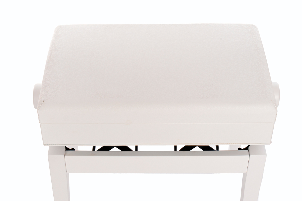 Høydejusterbar krakk i høy kvalitet med noterom. Hvit silkematt finish. Sete med god polstring og imitert skinn. 49-57cm (Målt fra gulv til toppen av setet)
