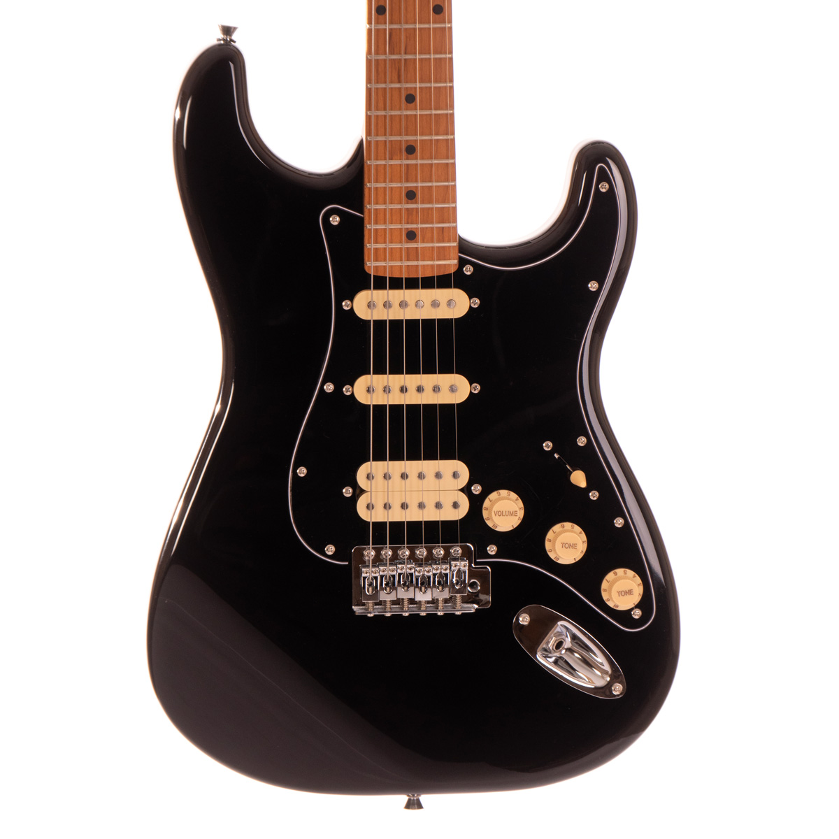 Pickupoppsettet består av humbucker i broposisjon og single coils i midt- og halsposisjon, styrt via en 5-veis bryter. Dette gir fleksible klangmuligheter som dekker både fyldigere lyder og klarere, mer definerte toner. Den svarte finishen gir gitaren et rent og tidløst uttrykk.