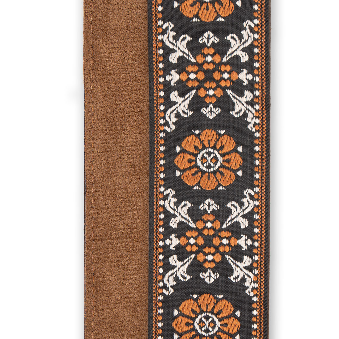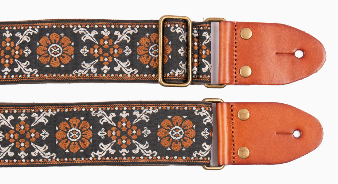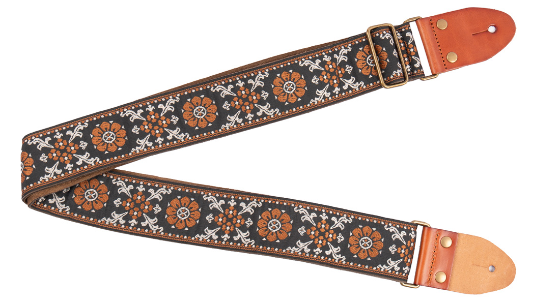 Ny Deluxe gitarreim med klassisk vevd mønster. Reimen er solid og med ekstra padding. Mikrofiber med «semsket skinn»-look på baksiden gir et ekslusivt utseende og sørger for at reima ikke glir. Italienske brune skinndeler og metallspenne i «aged» messing.