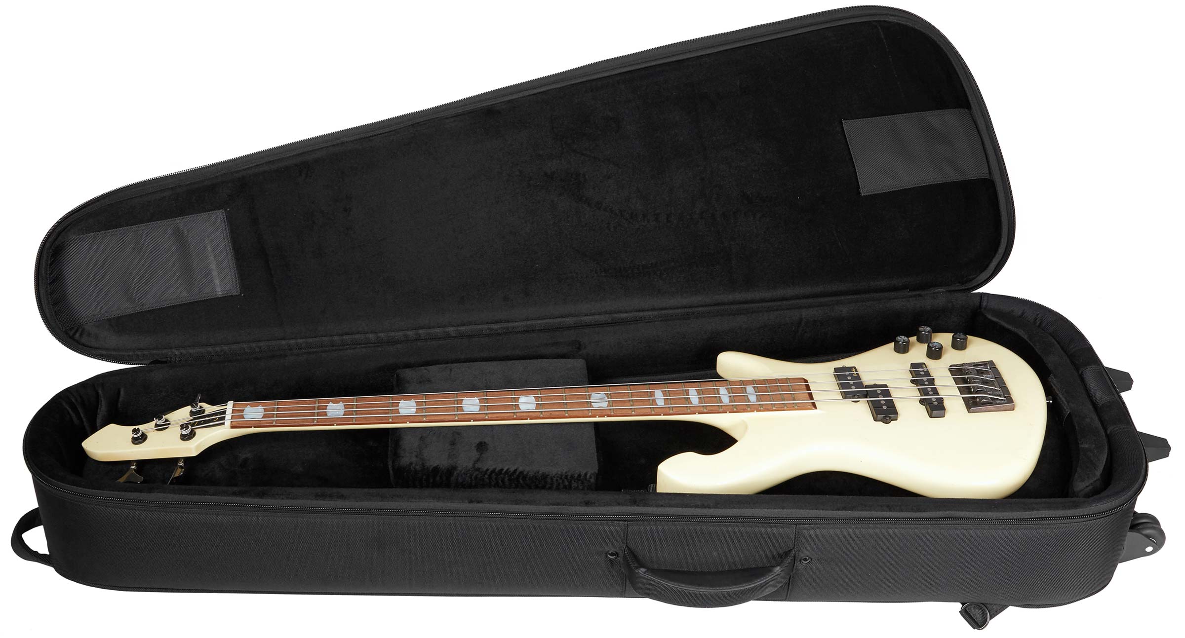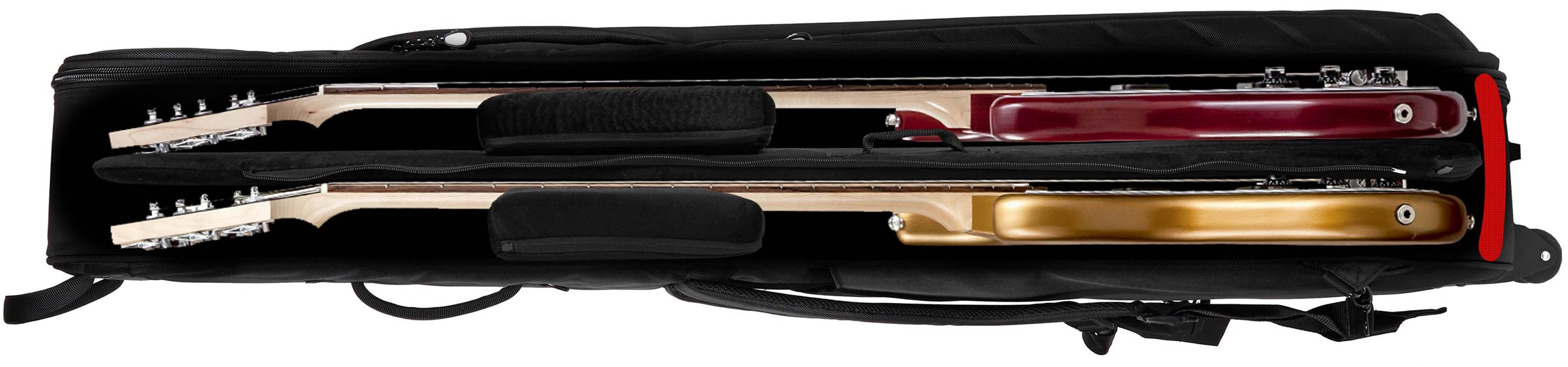 Music Area AA31 Dual Elektrisk Bassbag har 360 graders forsterket ABS-hardskall, 30 mm polstring med 7 lag, vannavstøtende og slitesterk nylonstoff, nakkestøtte med borrelås, avtakbar støtfanger for å beskytte stroppknappen, samt en stor lomme for tilbehør med forskjellige rom.