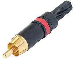 Male phono/RCA connector in metal housing with red coding and gold-plated contacts made by Rean (registered trademark of Neutrik AG)