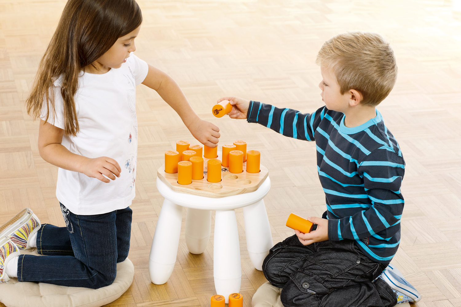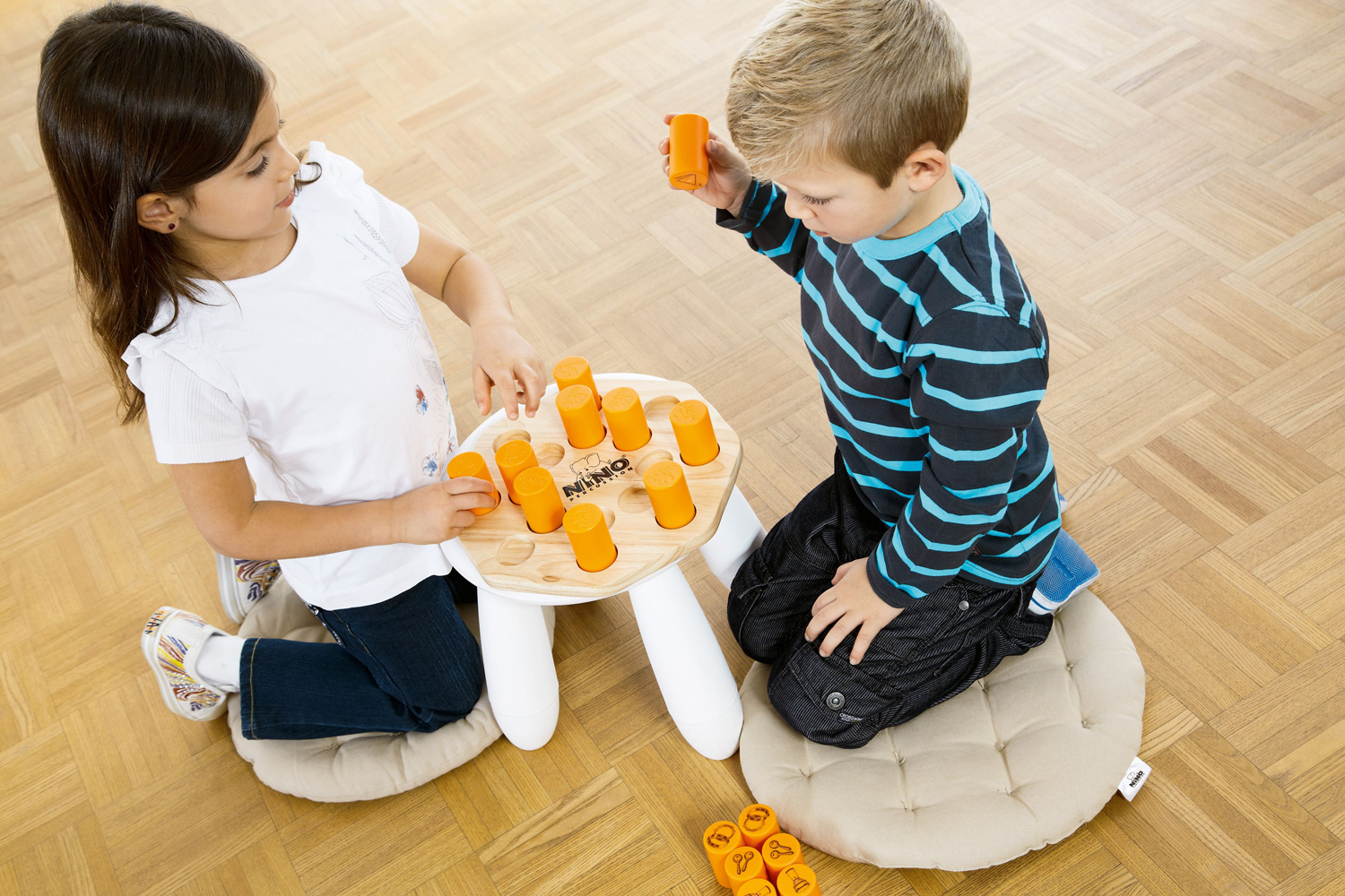 NINO526 Shake'n Play Memory Game. NINO526 Shake'n Play er et hukommelses spill der man med hjelp av bilde og lyd skal matche to og to shakere sammen. Tar man feil gjelder det å huske hvor på brettet den stod, til neste runde. Seksten shakere blir til åtte par med forskjellig bilde og forskjellig shaker lyd. Moro for hele familien. • Materiale: Gummitre (Hevea brasiliensis Muell.-Arg.) i brettet og shakerbrikker i plast. • Inneholder 16 shakere (8 par) og spilleregler på 8 språk. • Farge: Oransje brikker. • For 2 til 4 spillere. • Anbefalt fra 3 år. NINO® Percussion: Å få lære seg å spille et instrument og skape musikk i sin tidlige barndom gir næring til mange ting. Som f.eks oppfatning, motorikk og evnen til å lære og beholde informasjon. Å skape musikk bygger også opp selvtillit og sosiale evner. Dette er evner som gir fordeler lenge etter barndommen. NINO® Percussion tilbyr et enestående utvalg av musikkinstrumenter designet spesielt for barn. Instrumenter som mer enn gjerne møter dagens krav i den tidlige musikkutdannelsen i barnehagen og på grunnskolen. Det er viktig å poengtere at NINO® Percussion ikke er leker. Dette er ordentlige musikkinstrumenter, designet med tanke på sikkerhet, holdbarhet, tiltrekkelse og funksjon. Og viktigst av alt er at de høres riktige ut og er musikalske. Faktum er at den eneste forskjellen mellom NINO® Percussion og tilsvarende instrumenter for voksne, er form og farge. Disse tiltalende og behagelige kreasjonene har alle blitt designet i Tyskland. Uansett om du utøver musikk alene eller i en gruppe så er funksjonaliteten og lydkvaliteten på NINO® Percussion instrumentene så god at de er et opplagt valg for barn og ungdomer, samt for deres lærere. NINO® Percussion tilstreber minst mulig miljøbelastning under produksjonen, og det naturlige materialet som brukes kommer fra miljøstyrte og sertifiserte plantasjer.