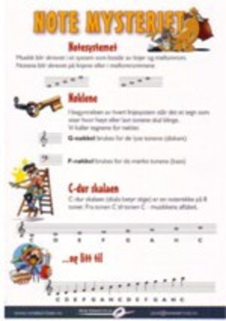 Notemysteriet er en enkel innføring i notelære (4 sider A5 plastfoliert papir) Notesystemet - Nøklene - C-dur skalaen - ....og litt til - Taktinndeling - Noteverdier - Pauser - Repetisjonstegn - Gjentagelsestegn - Fortegn - Tempobetegnelser - Styrketegn
