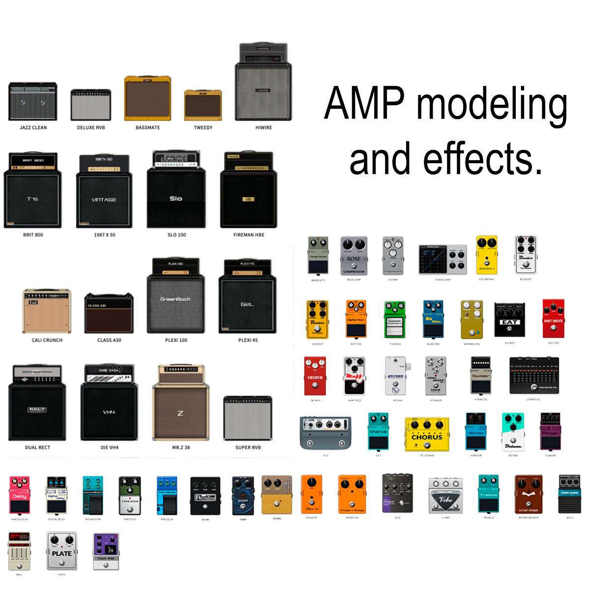 - Effektblokker: GATE, COMP, EFX, AMP, EQ, MOD, DLY, RVB med fri rekkefølge