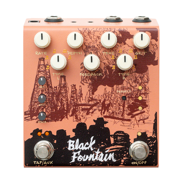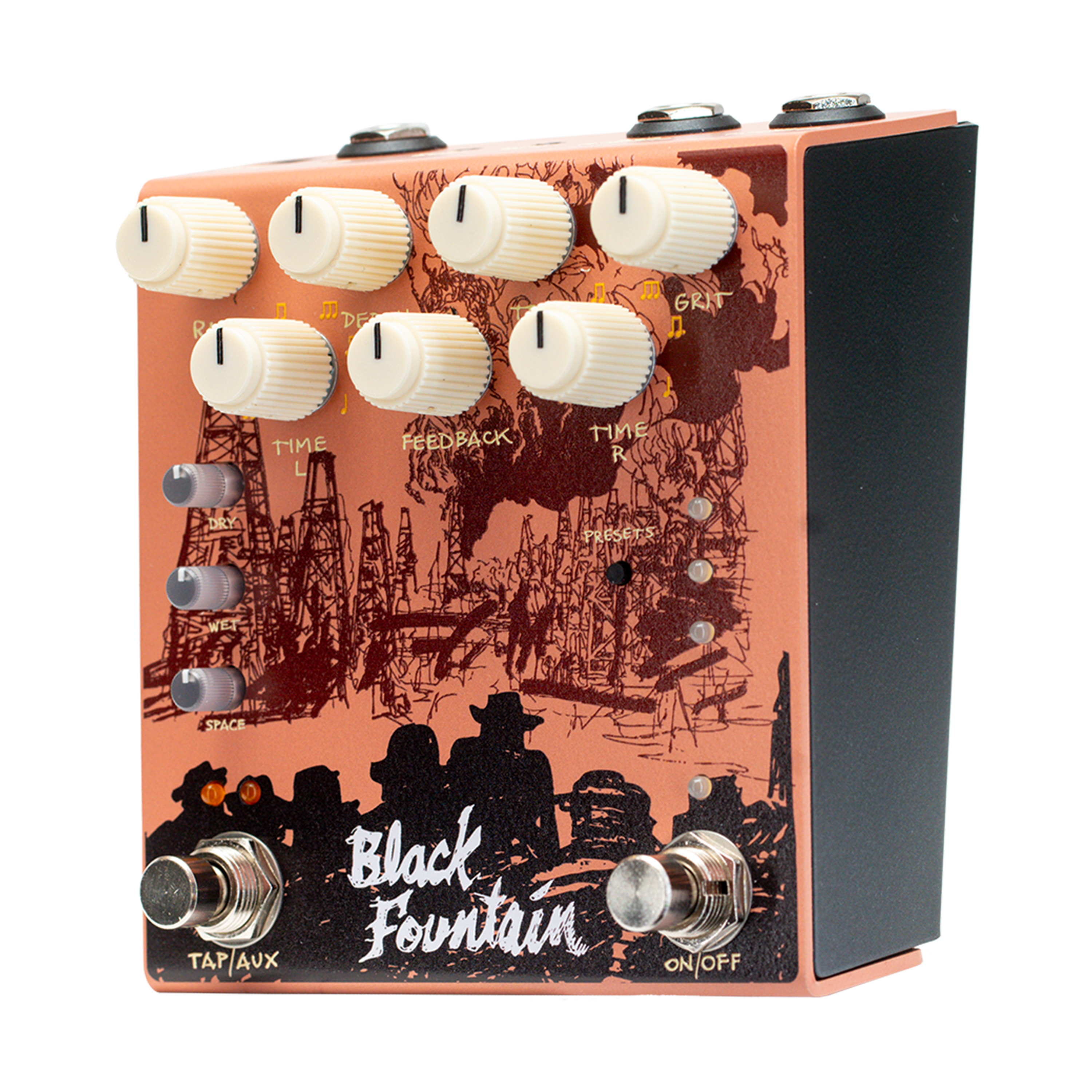 Med et bredere kontrollsett, flere lydalternativer, lavere støygulv, doble delay-linjer som spiller sammen på mange måter, forhåndsinnstillinger, MIDI og uttrykkskontroll over alt, kombinerer Black Fountain Stereo et sonisk kraftsenter av kreative delay-lyder i en pedalbrettvennlig pakke.