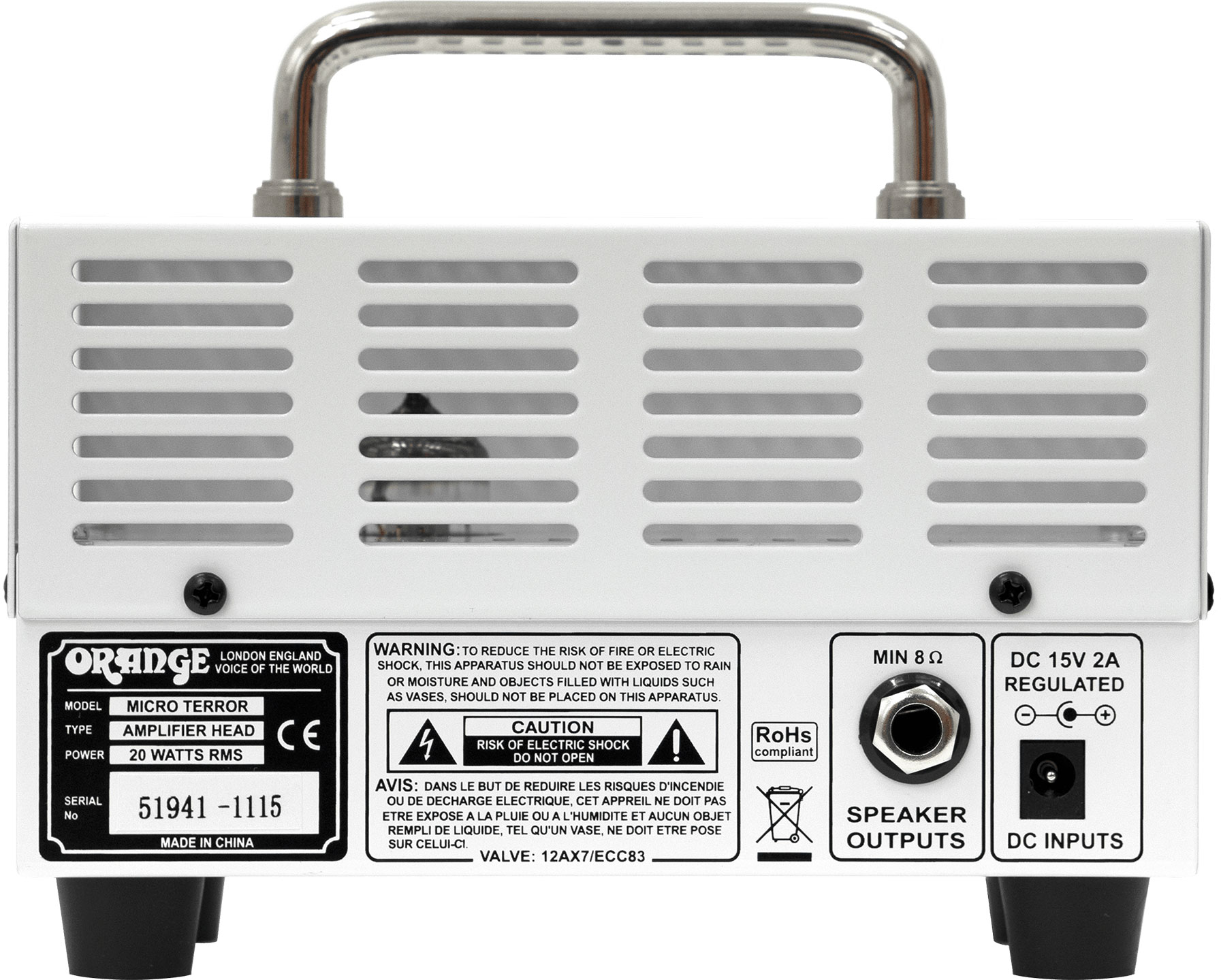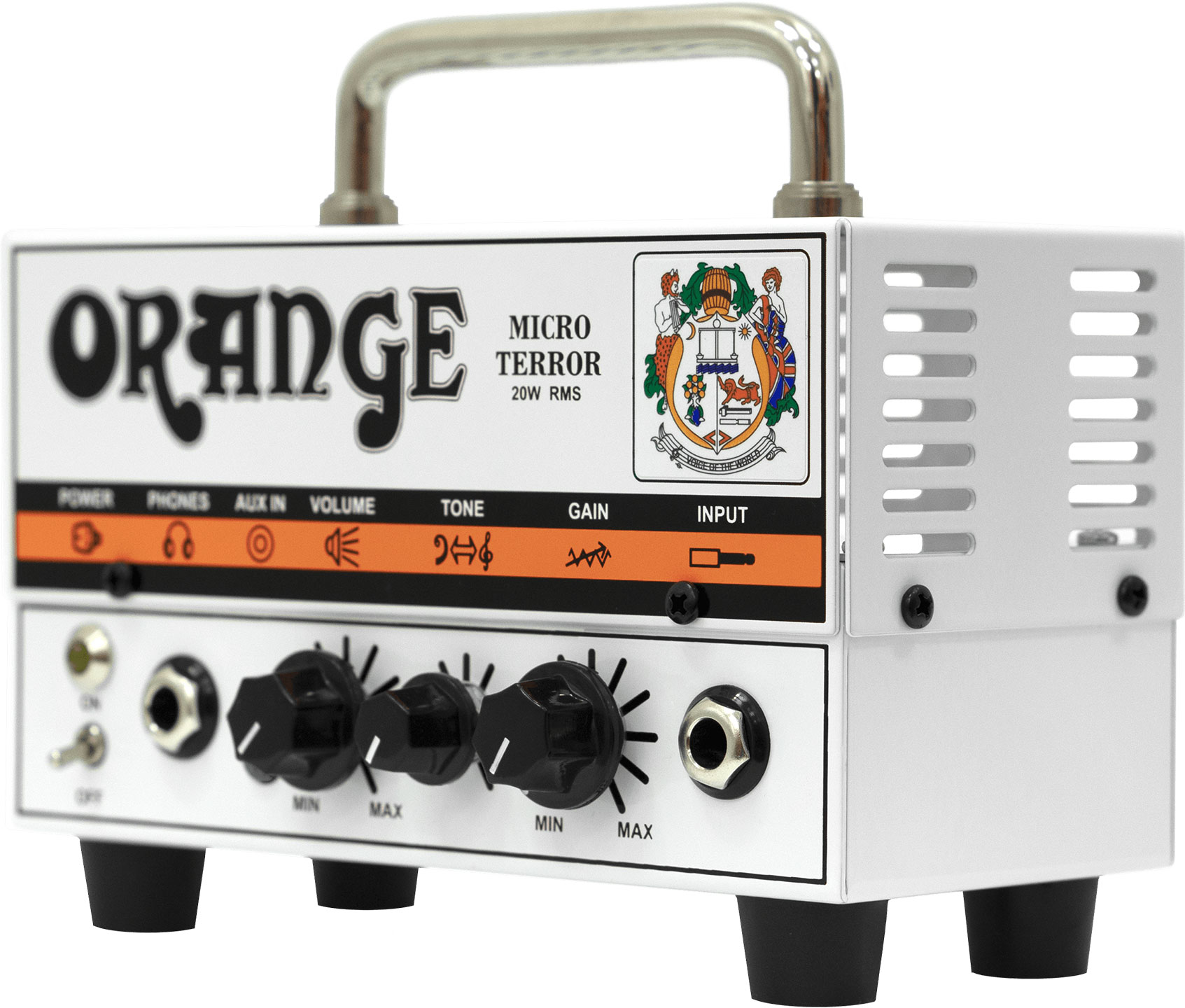 Micro Terror MT20H Förstärkartopp, hybrid med rörpreamp och solid state slutsteg. Väger endast 1 kg, robust metallchassi, 20 watt. Förbluffande stort sound i ett ultrakompakt format. Weighing in at under 1 kilo, the Micro Terror is arguably the most portable amp head on the market. When paired with its matching PPC108 cabinet, the Micro Terror’s Aux Input and Headphone output make it a perfect practice partner, small enough for even the most cluttered sideboard. However, don’t be fooled by its miniature footprint because size is the only thing that is small about this amp. With a high tensile steel casing, the Micro Terror is built to the same high standards as the rest of the Terror family and features a single 12AX7/ECC81 preamp valve, coupled to a solid state output section. The depth of sound (and volume) that this little thing pushes out is truly staggering, with Orange growl and bite in abundance. What’s more, the Micro Terror can be used with any 8-16 Ohm speaker cabinet.