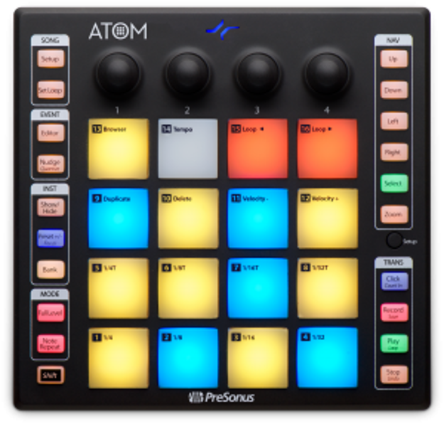 PreSonus ATOM er en kraftig og responsiv MIDI-pad-kontroller med 16 velocity- og trykkfølsomme RGB-pads, laget for beatmaking, virtuell instrumentstyring og live triggering av lydeffekter og looper. Den er sømløst integrert med Studio One Artist (medfølger) og Ableton Live Lite, og lar deg produsere musikk raskt og intuitivt – uten å stirre på skjermen.