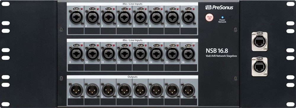 Presonus NSB 16.8 er en kraftig og fleksibel stagebox designet for å utvide StudioLive Series III-miksebord med 16 låsbare kombi mikrofon-/lineinnganger utstyrt med fjernstyrte Class A XMAX-forforsterkere. Hver inngang har gainkompensasjon, som tillater flere miksere på samme AVB-nettverk å justere preamp-nivåene lokalt for optimal lydstyrke og kvalitet.