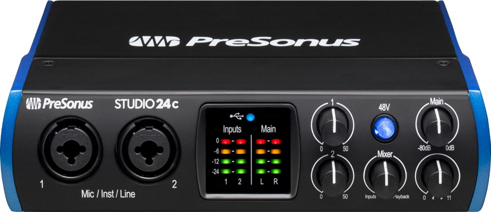 PreSonus Studio 24c er et kompakt og robust USB-C-lydkort som leverer profesjonell lydkvalitet med 24-bit/192 kHz oppløsning. Med to XMAX-L mikrofonforsterkere og kombinerte mic/line/instrumentinnganger er det ideelt for alt fra vokalinnspilling til direkte tilkobling av gitar eller bass.