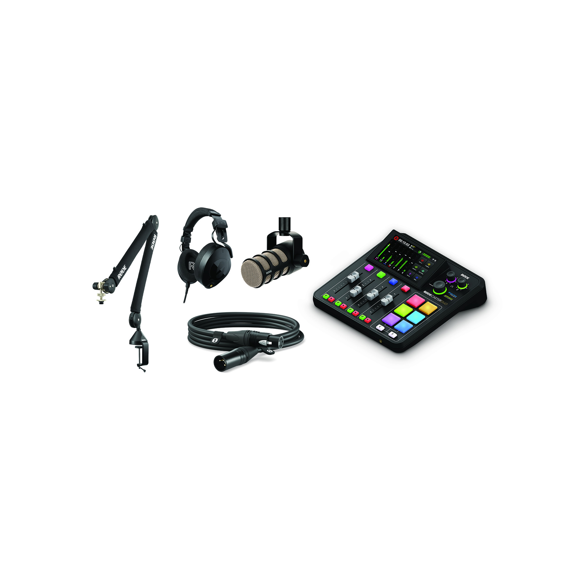 RØDE Solo podcasting bundle er en perfekt bundle for deg som stiller høye krav til sitt podcastutstyr og ønsker god lydkvalitet og komfort. Bundlen inneholder en RØDEcaster DUO, 1 RØDE PodMic, 1 NTH-100 hodetelefoner, 1 PSA 1 + Professional Studio Arm og 1 Røde XLR 3m XLR / XLR kabel.