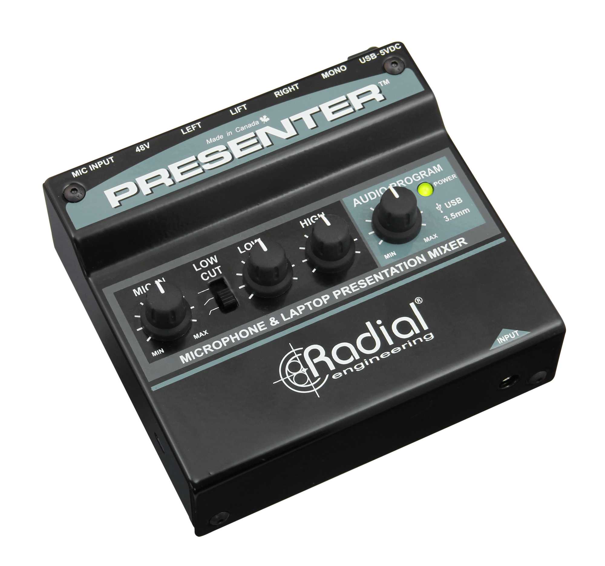 Radial Presenter er en kompakt mikser som kombinerer en mikrofonforforsterker og en USB-programinngang for å skape den ultimate løsningen for presentasjoner, fra skoleforedrag til bedriftsmøter.