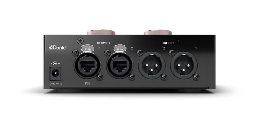 Stereo Dante monitorinterface med hodetelefon og linje ut. Integrert switch. PoE.