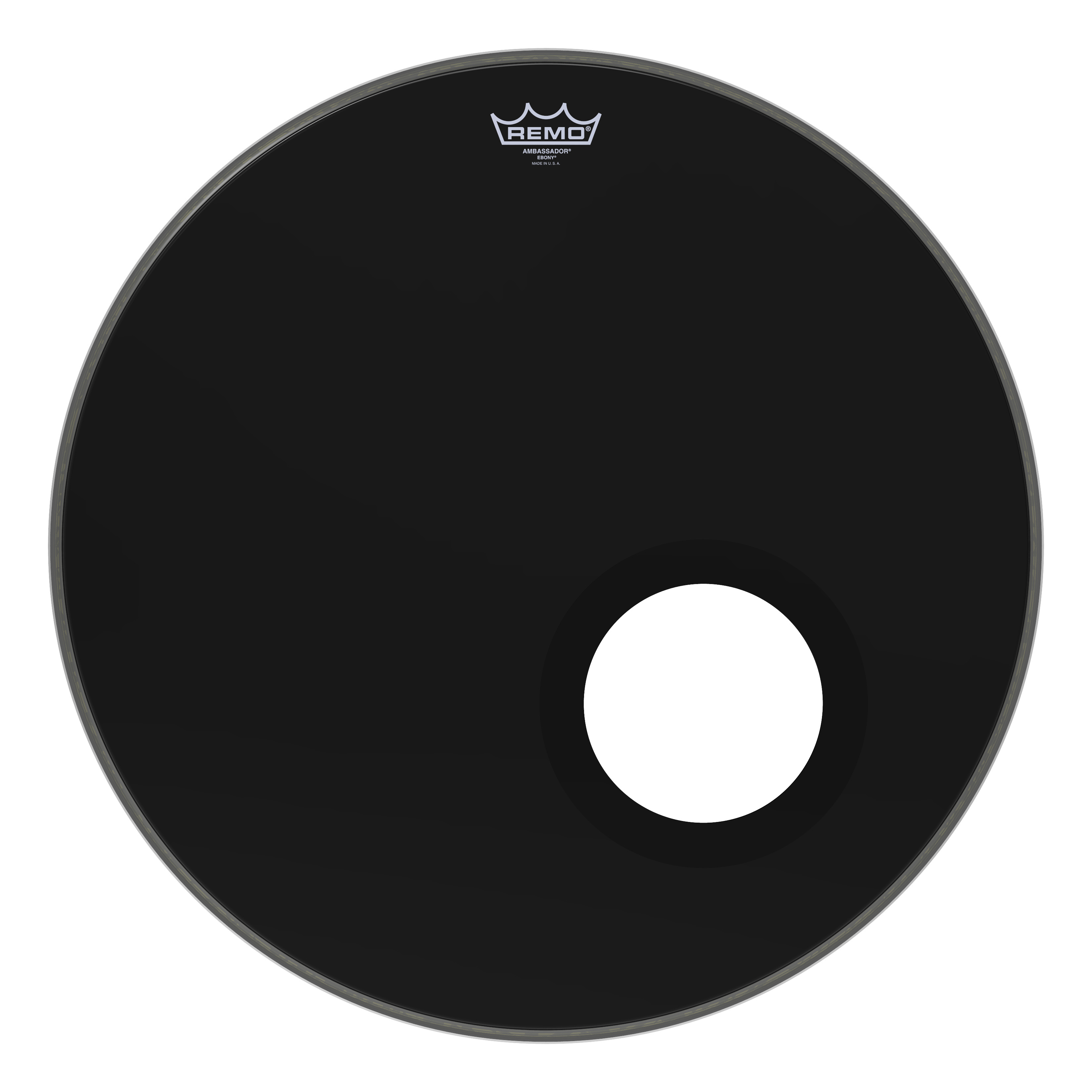 The Ambassador® Ebony® 5" Black DynamO features open resonant tones with a reflective black look and a pre-cut 5" hole with a DynamO reinforcement ring. Constructed with 1-ply of 10-mil Ebony® film, Ambassador® Ebony® drumheads are ideal for bass drum resonant heads and are the industry standard. The pre-cut 5" hole is perfect for external bass drum mics. Ambassador® Ebony® heads are available is sizes 18" - 24".