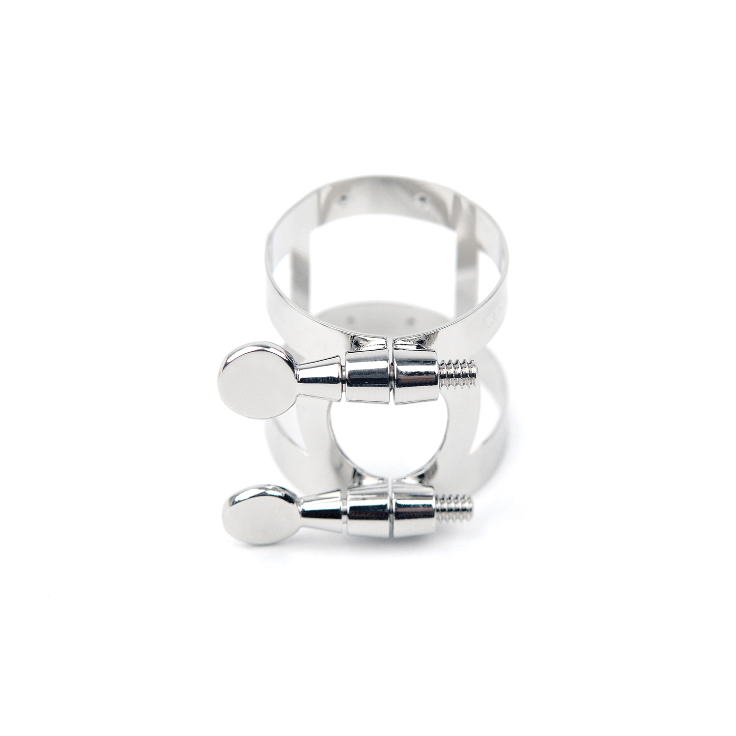 RCL1LN. Ligature Bb Klarinett. Klassisk rørholder for Klarinett. Produsert i nickelbelagt messing i tradisjonell to-skruers utførelse. Nå med firepunktstrykk for jevnere trykk mot røret.