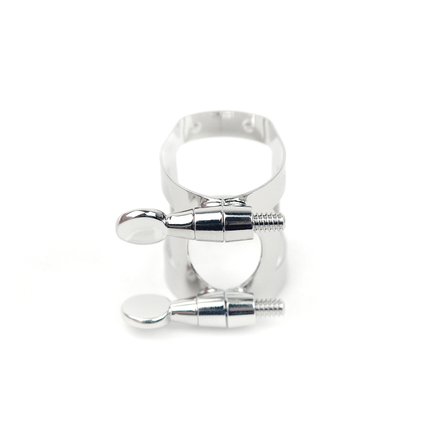 RSS1LN. Ligature Sopran-sax. Klassisk rørholder for sopransax. Produsert i nickelbelagt messing i tradisjonell to-skruers utførelse. Nå med firepunktstrykk for jevnere trykk mot røret.
