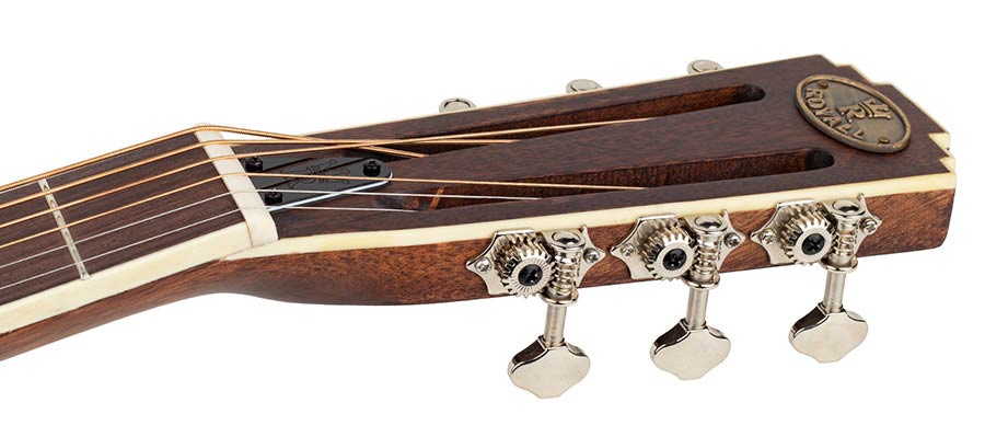 Kroppen er laget i mahogni og har satin sunburst-finish, noe som understreker instrumentets tradisjonelle uttrykk. Gitaren er bygget med single cone biscuit bridge-konstruksjon og er utstyrt med en håndspunnet 9,5" aluminiumskjegle. Royall Resonator-gitarer har lang erfaring med egenproduksjon av resonatorkjegler, noe som gir modellene et særpreg i både respons og klang.