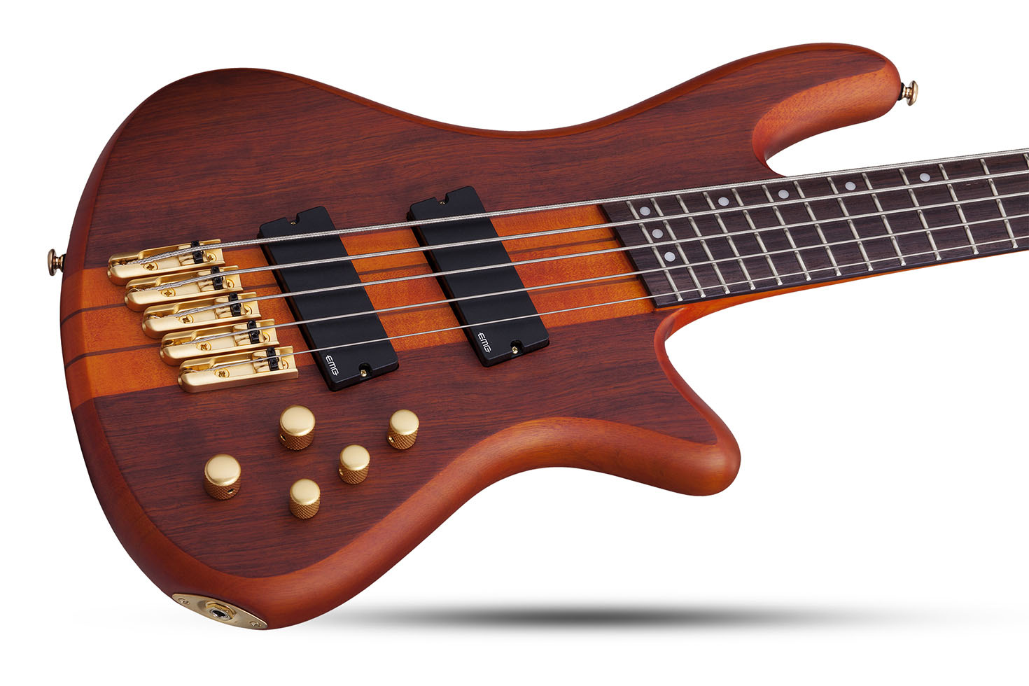 Schecter Stiletto Studio 5 Fanned Frets Honey Satin 5-strängad elbas med Fanned Frets, aktiva EMG pickups och genomgående hals STILETTO STUDIO-5 FF HSN HSN Stiletto Studio är en serie professionella basar med lyxiga materialval och aktiva EMG pickups samt genomgående hals. Fanned Frets ger fördelen med ett fylligare sound i de tjockare strängarna och bättre brightness i de tunnare strängarna. Med sin aktiva 3-bands EQ kan man enkelt ratta fram ett sound för allt från metal till dub och konstruktionen med genomgående hals ger en riktigt härlig sustain.