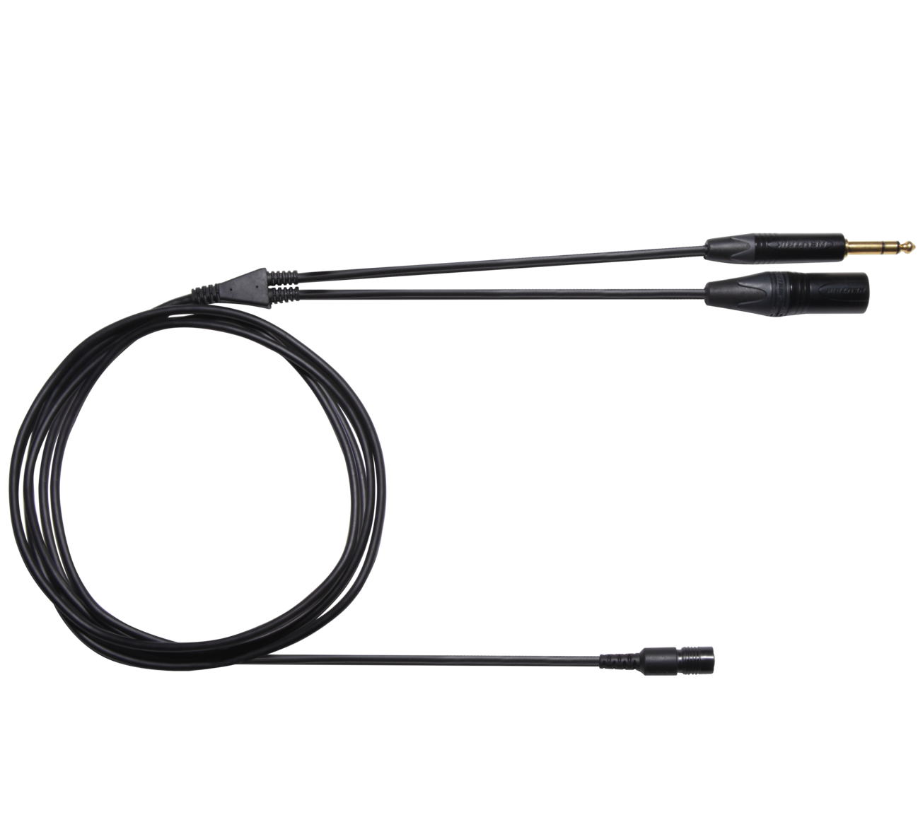 Shure kabel for BRH broadcastheadset forbinder BCASCA-kontakt med en 3-pins Neutrik XLR-kontakt og en 6,3 mm stereo Neutrik jack. Kabelen er designet for pålitelig lydoverføring i profesjonelle studiobruksområder.