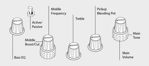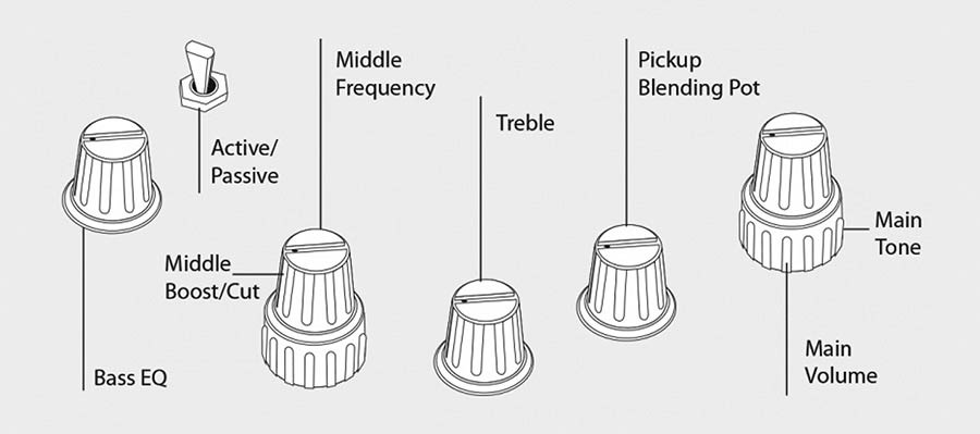 controls: volume/tone (dual pot) : pickup blender : treble : middle/middle frequency (dual pot) : bass, mini toggle (active/passive)