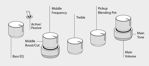 controls: volume/tone (dual pot) : pickup blender : treble : middle/middle frequency (dual pot) : bass, mini toggle (active/passive)