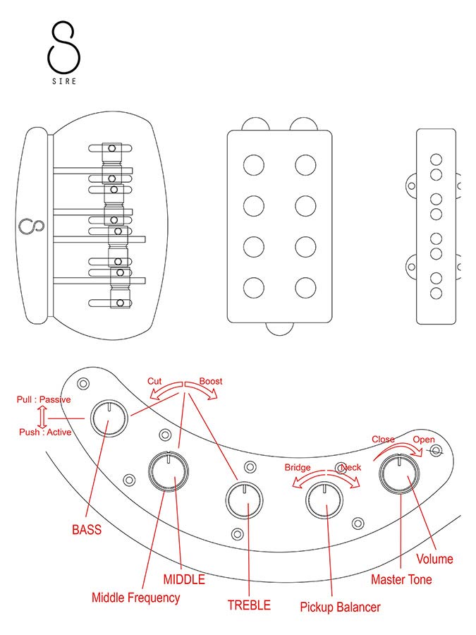 - Elektronikk: Marcus Heritage-3 aktiv preamp med justerbar mellomtonefrekvens