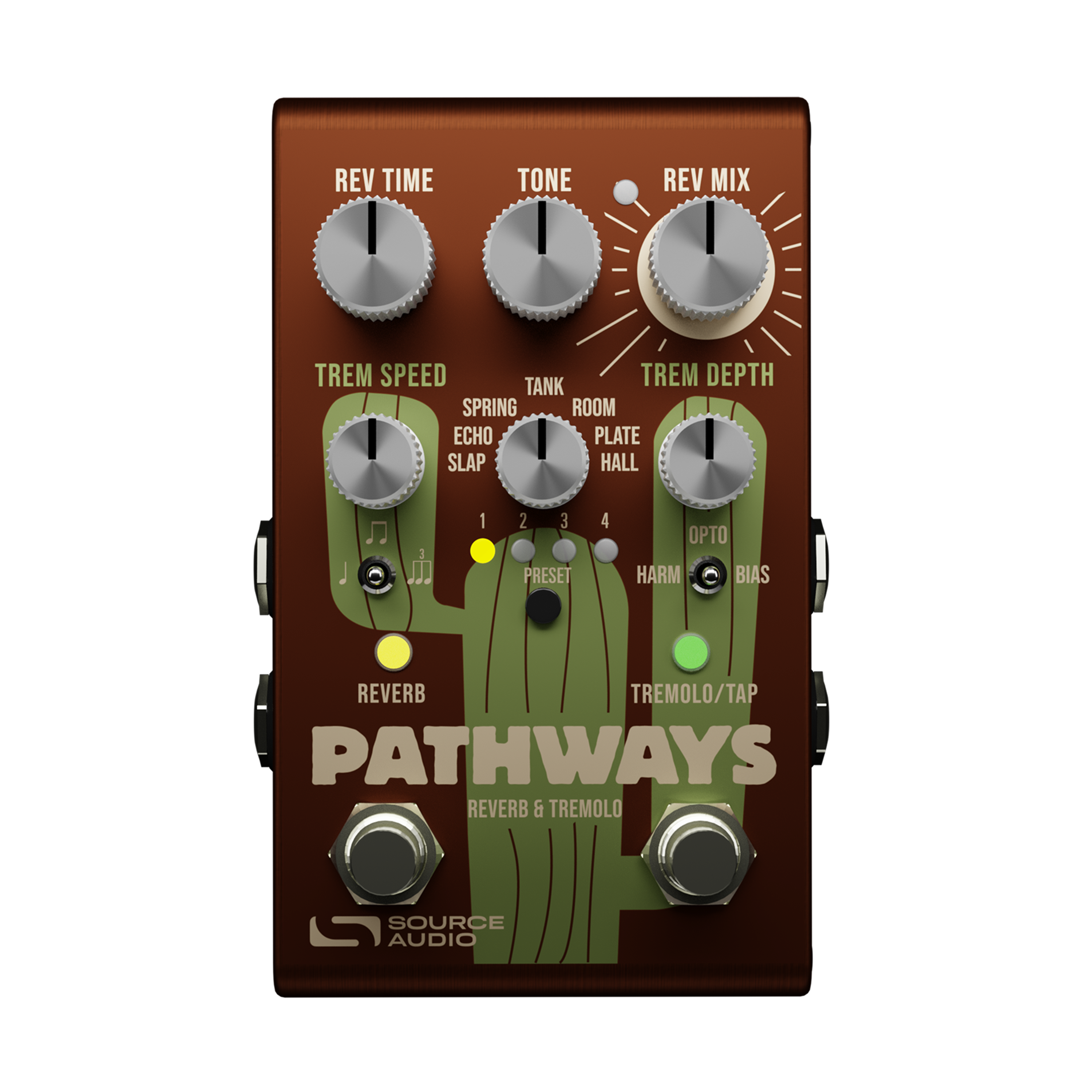 Source Audio Pathways er en kompakt stereo effektpedal som kombinerer reverb og tremolo i én enhet. Denne klassiske effektkombinasjonen har vært en viktig del av lydbildet i rock, blues og country i flere tiår, og Pathways samler begge effektene i et format som gir rask og intuitiv tilgang til et bredt spekter av lyder.