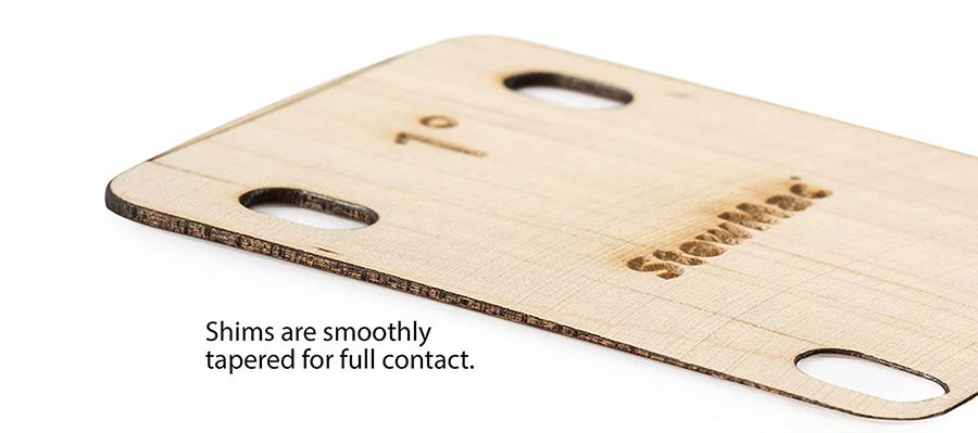 Shimmen er laget i massiv lønn for å matche materialet i gitarhalser, og passer de fleste Fender-halser med avrundet hæl. Den kan også trimmes langs lasermarkert linje for å passe halslommer med flat hæl, som på TL-stil.