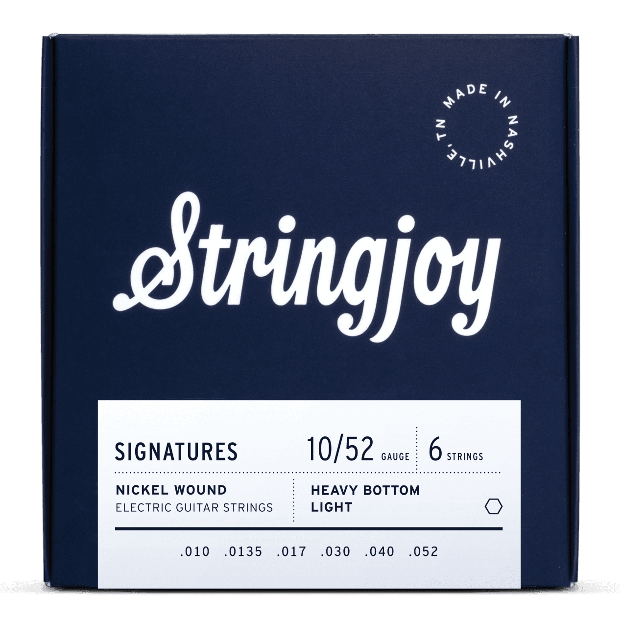 Stringjoy Heavy Bottom Light Gauge Signatures 10-52 er nickel-wound strenger designet for elektrisk gitar med lettere toppstrenger og kraftigere bunnstrenger. Dette gir en rik og kraftfull tone med klar artikulasjon, samtidig som spillegleden og bøybarheten opprettholdes.