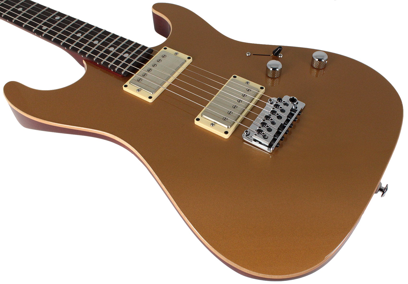 Kroppen er bygget i mahogni med lønnetopp, og halsen er i mahogni med satin Trans Brown-finish. Gripebrettet er i Indian Rosewood og har 10"–14" compound radius, noe som gir en spillfølelse som fungerer både til akkordspill, bending og mer teknisk leadarbeid. Halsprofilen er Even C Slim .800–.880, og gitaren har 22 jumbo rustfrie bånd.