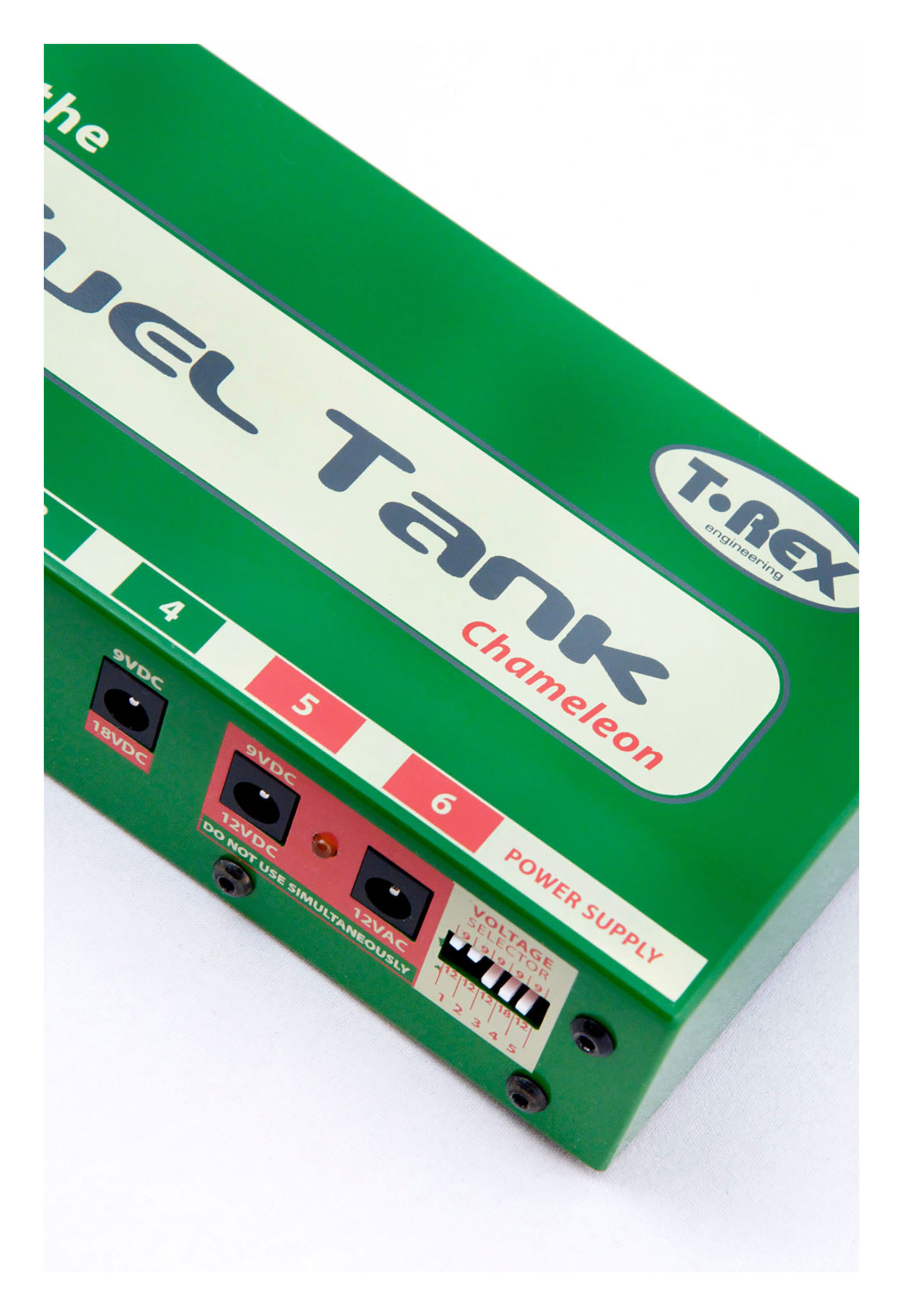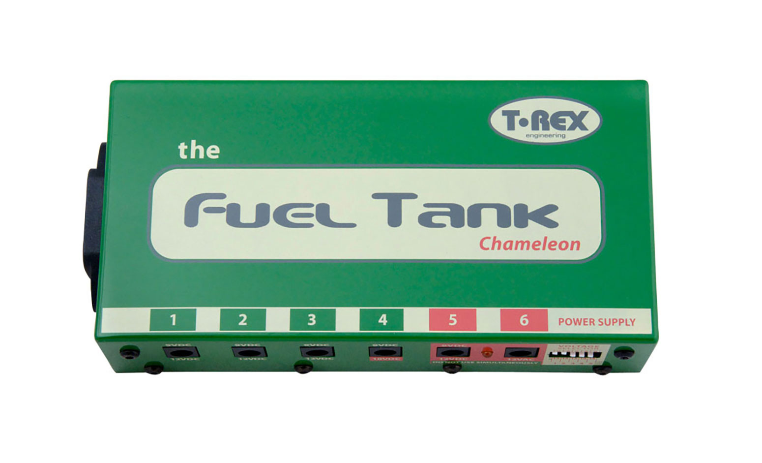 FuelTank Chameleon Strömförsörjning för flera pedaler 9-18V Chameleon är storsäljaren i FuelTank Familjen. Med isolerad ström per utgång, 9,12 och 18V utgångar och möjligheten att mata 300mA per utgång krävs det ett stort pedalbord för att den inte skall räcka till. Lägg till sitt goda ryckte för att alltid leverera och aldrig krångla så har vi hittat en riktig arbetshäst oaavsett om du är proffs elle nybörjare Enter the new Fuel Tank Chameleon, the most versatile power supply T-Rex has ever produced. Built for players with a large number of diverse pedals, Fuel Tank Chameleon offers all the advantages of our other Fuel Tank power supplies, plus an unprecedented 4 separate voltage options. Part of the FuelTank family The Fuel Tank Chameleon is only the latest addition to the T-Rex Fuel Tank family. Our original Fuel Tank Classic features 9V DC, 12V DC and 12V AC outlets in three isolated blocks of 500mA each and is ideal for medium-sized pedal boards. It comes with lots of single patch cables and a multiple link cable. The Fuel Tank “Juicy Lucy” powers 5 12V pedals and also offers great extras, like multiple unit linking. The baby of the family – Fuel Tank Junior – is a good choice for a small number of 9V pedals. It offers both current doubling to 240 mA and voltage doubling to 18V. Miscellaneous Placement; as far away from pedals as possible (preferable at least last in the chain close to Analog/drive pedals) in order to reduce noise interference in the signal chain.