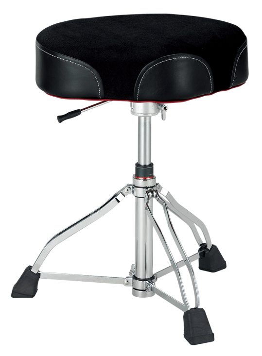 TAMA 1st Chair Ergo Rider Hydraulix trommestol HT750BC. Trommestol med doble ben og hybrid motorsykkel-/rundt sete. Hydraulisk høydejustering. Stoff sitteflate. 1st Chair. Høsten 2016 oppgraderte Tama sin legendariske 1st Chair serie. De har beholdt de solide setene, laget av 12 mm kryssfiner med støpt skum og godt sydd møbeltrekk som vil vare år etter år. Det er hovedsakelig underdelen og seteholderen, Seat Lock, som er oppdatert for økt stabilitet. I tillegg har bena en annen form med omplasserte mellomliggende stag og større gummiføtter. Den raske høydejusteringen er fremdeles der, men med en ny lås som holder innerrøret i et jerngrep. Tama viser nok en gang hvorfor de er markedsleder på trommelstoler! Hvis du vil få bedre holdning og ekstra ryggstøtte, kjøp ryggstøtte HTB5B som passer både til de nye og gamle 1st Chair modellene. Fire grunnleggende alternativer tilbys: Round Rider, Wide Rider, Ergo Rider og Round Rider XL. De 3 førstnevnte er tilgjengelige som alternativer med stoffsete. Hydraulisk underdel tilbys i Round Ride XL og Ergo Ride. Spesifikasjoner: • Hydraulix - Enkel og rask hydraulisk høydejustering. • Seat Lock - Todelt feste med gjenger og dypere innfesting og ekstra kraftig vingemutter, for solid setefeste. • Super Stabilizator Design - Lavere underdel, ny fasong på benene og kraftigere gummiføtter gir økt stabilitet. • Høyde - Gjenget justering mellom 555mm og 685mm.
