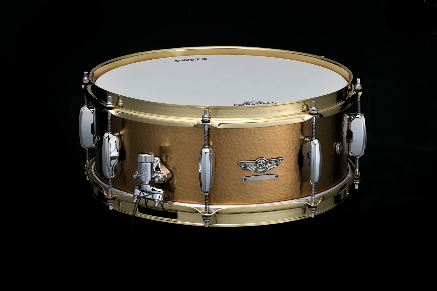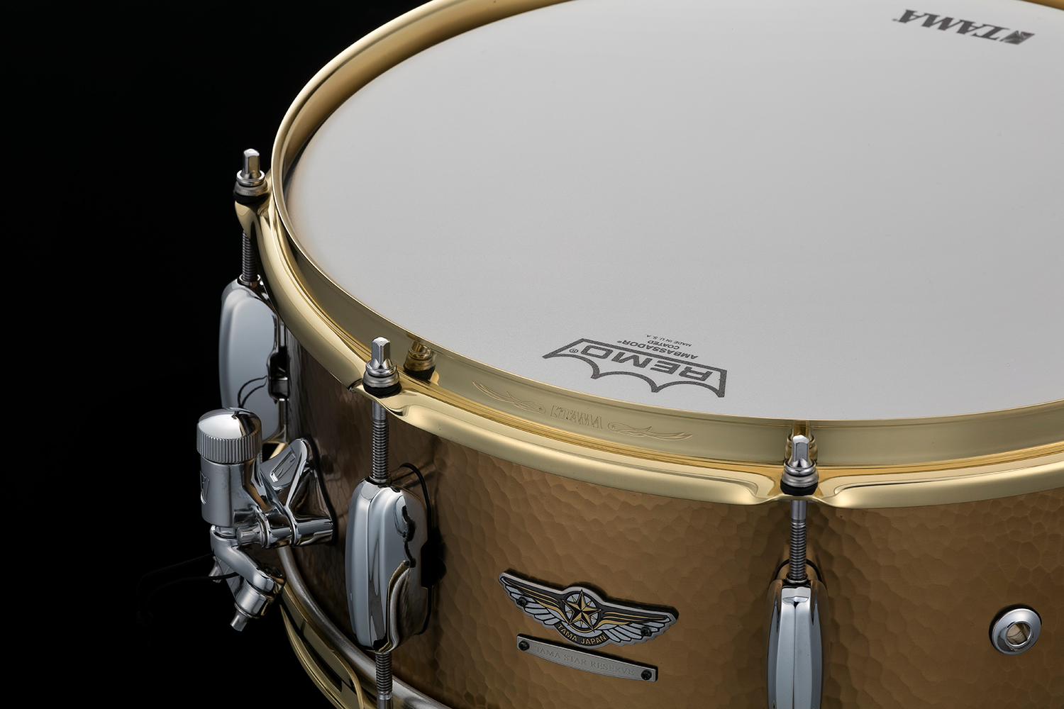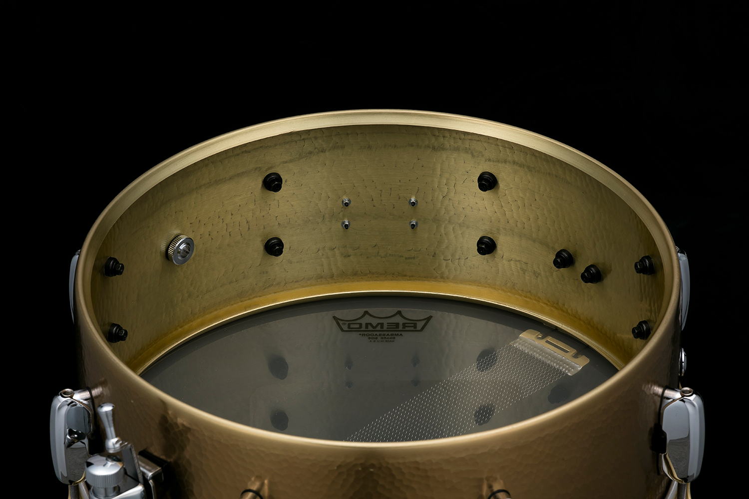 TBRS1455H TAMA STAR Reserve Hand Hammered Brass Snare Drum - TBRS1455H. 14 x 5,5 skarptromme i håndhamret messing. I tråd med håndverket og kvaliteten på tidligere STAR Reserve skarptrommer, introduserer TAMA en annen tromme i serien - STAR Reserve 5.5x14 Hand Hammered Brass Snare Drum. Denne trommen har en 1,5 mm tykt messing kropp, spesialtilpassede messing Flanged Hoops og et unikt hammermønster. På tross av sin noe grunnere kropp har har skarpen en dyp bunntone og et usedvanlig bra og tydelig seidesvar, som gir herlige ghost-strokes. Specs: • Størrelse: 14 x 5,5 . • Shell: 1,2mm Hand Hammered Brass Shell. • Bearing Edge: Avrundet 3,5mm. • Sargringer: Spesialtilpasset Brass Mighty Hoops med 8 hull. • Seide: MS20RL14C • Seidemekanikk: MLS50A/MLS50B. • Holdt-TightTM Washers.