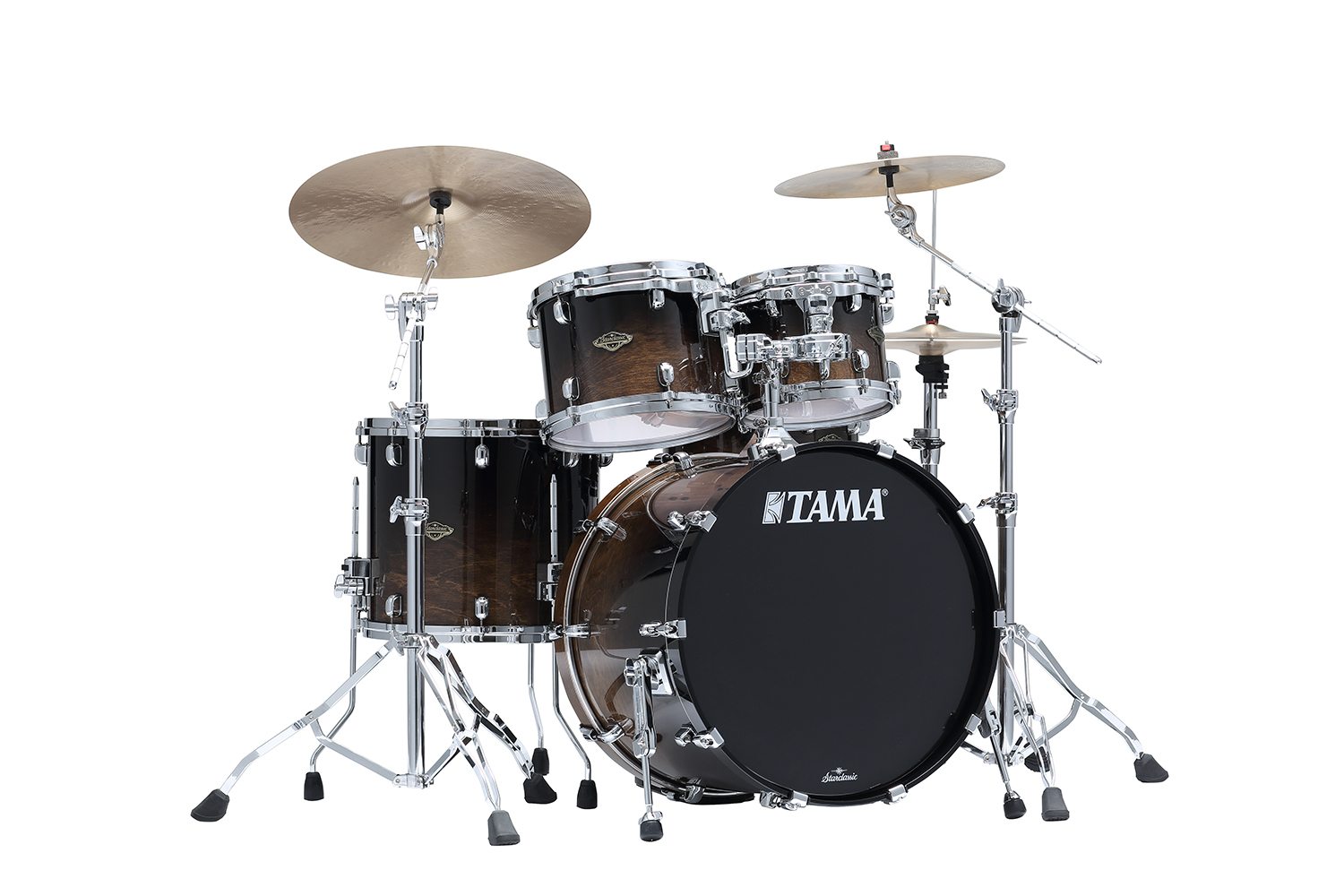 TAMA Starclassic Walnut/Birch Drum Kit WBS42S-TMF, Transparent Mocha Fade. 4-trommers shell-pack bestående av: 22 x 16 BD, 16 x 14 FT, 12 x 9 TT, 10 x 7 TT. Leveres med 2 stk. MC69 Single Tom Attachment. Walnut/Birch sett med 4 lag bjørk + 2 indre lag med valnøtt. Tama’s hybridsett kombinerer Walnut med Birch og leverer både stor fundamental tone og stabil bunn. Den tydelige og rene tonen gjør Starclassic W/B uhørt lettstemte uansett om man foretrekker høyt stemte enkeltlagsskinn, eller lavt stemte dobbeltlagsskinn. I likhet med alle Starclassic har Walnut/Birch Starclassic Lugs, Die-Cast Hoops, Star-Cast Mount med Quick-Lock tom-feste, for optimal lyd og håndtering. Starclassic W/B er helt unike, men allikevel fantastiske allround trommer. Specs: • Størrelser: 22 x 16 , 16 x 14 , 12 x 9 , 10 x 8 . • Farge: Transparent Mocha Fade. • Shell: 6mm, 4-lags Birch + 2 indre lag American Black Walnut på toms. 8mm, 5-lags Birch + 2 indre lag American Black Walnut på basstromme/skarptromme. • Star-Cast Mounting System: slank tom-brakett for bra lyd og plassering. • Sargringer: Die-Cast Hoops. • Quick-Lock tom- og gulvtombenfester. • Gulvtomben: Ben med air-pocket gummiføtter som gjør tromma flytende for maks resonans. • Basstrommeben: 2-delt med gummiforing. • Leveres med EVANS® skinn: G2 clear på toms, EQ4 på basstromme. *Visse modeller lagerføres, andre har ca. 4-5 måneders leveringstid.