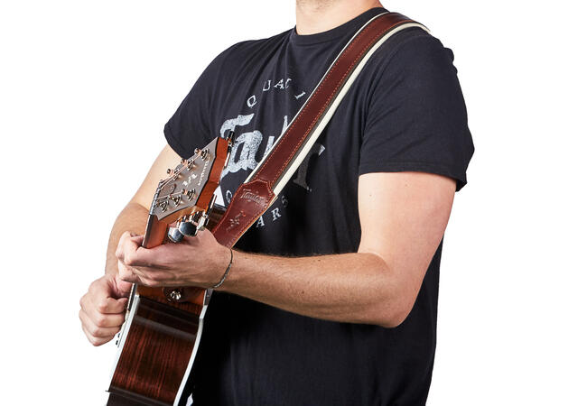The Taylor Renaissance Leather Guitar Strap offers a choice of two classic color options: Medium Brown or Cordovan, both of which feature black and ivory leather trim. Both color options are artfully designed to complement guitars from the Taylor 400 Series, but it looks great alongside any acoustic guitar. This strap also features an embossed Taylor logo, and at 2.5" wide, it provides the perfect balance of comfort and support. Made in the USA. Taylor Model #4105-25 (Medium Brown), #4106-25 (Cordovan)