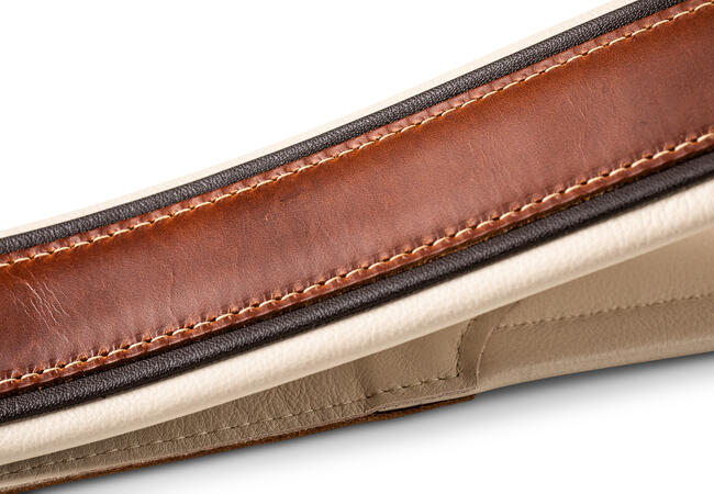The Taylor Renaissance Leather Guitar Strap offers a choice of two classic color options: Medium Brown or Cordovan, both of which feature black and ivory leather trim. Both color options are artfully designed to complement guitars from the Taylor 400 Series, but it looks great alongside any acoustic guitar. This strap also features an embossed Taylor logo, and at 2.5" wide, it provides the perfect balance of comfort and support. Made in the USA. Taylor Model #4105-25 (Medium Brown), #4106-25 (Cordovan)