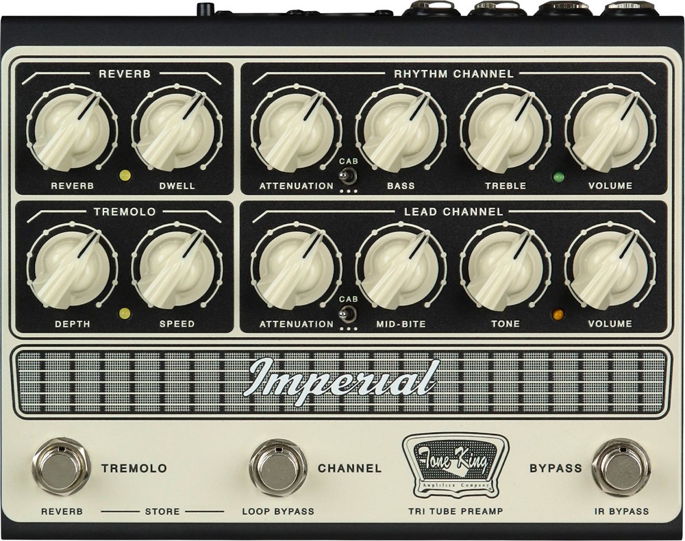 Imperial All-Tube Preamp-pedalen leverer Tone Kings legendariske MKII-forsterkerlyder – fra ’50-tallets tweed, ’60-tallets blackface og klassisk britisk rock – i et kompakt, pedalbrettvennlig format. Den inneholder nøyaktig samme forforsterkerseksjon og fasevenderkrets som Imperial MKII-forsterkeren, i tillegg til reverb, tremolo og demping, noe som resulterer i en pedal som synger med harmonisk fylde og følsom respons.