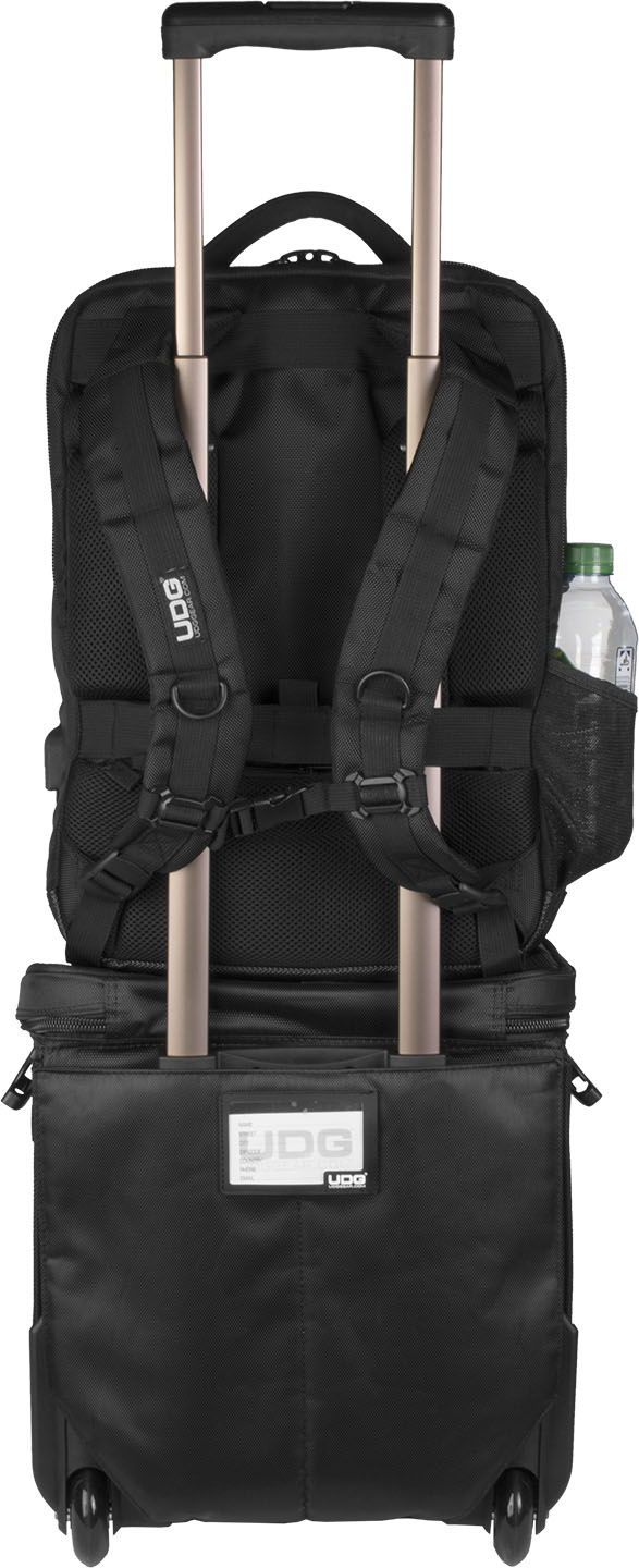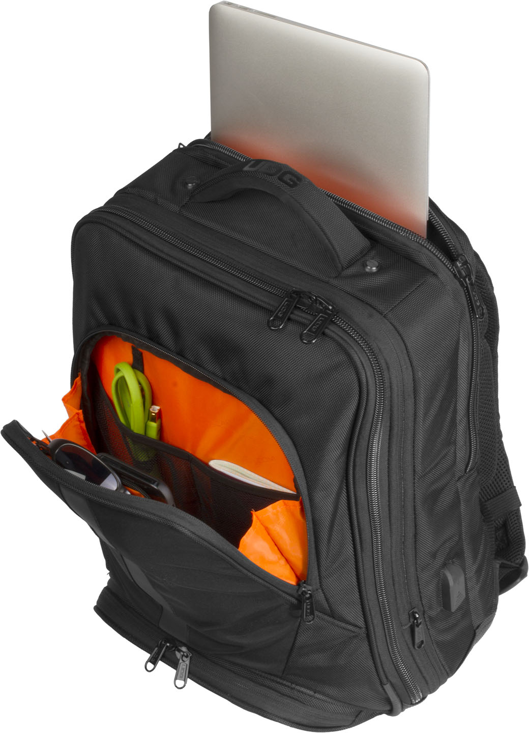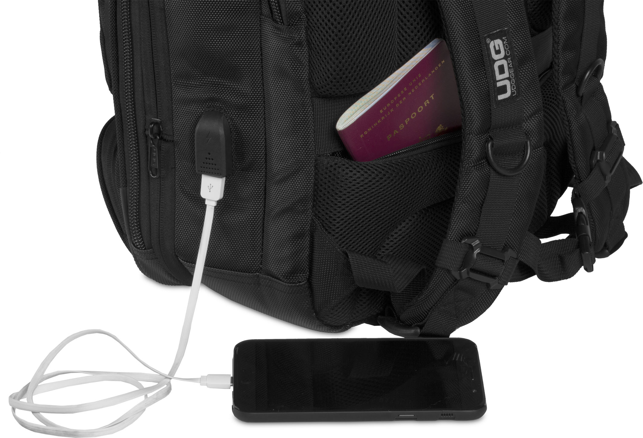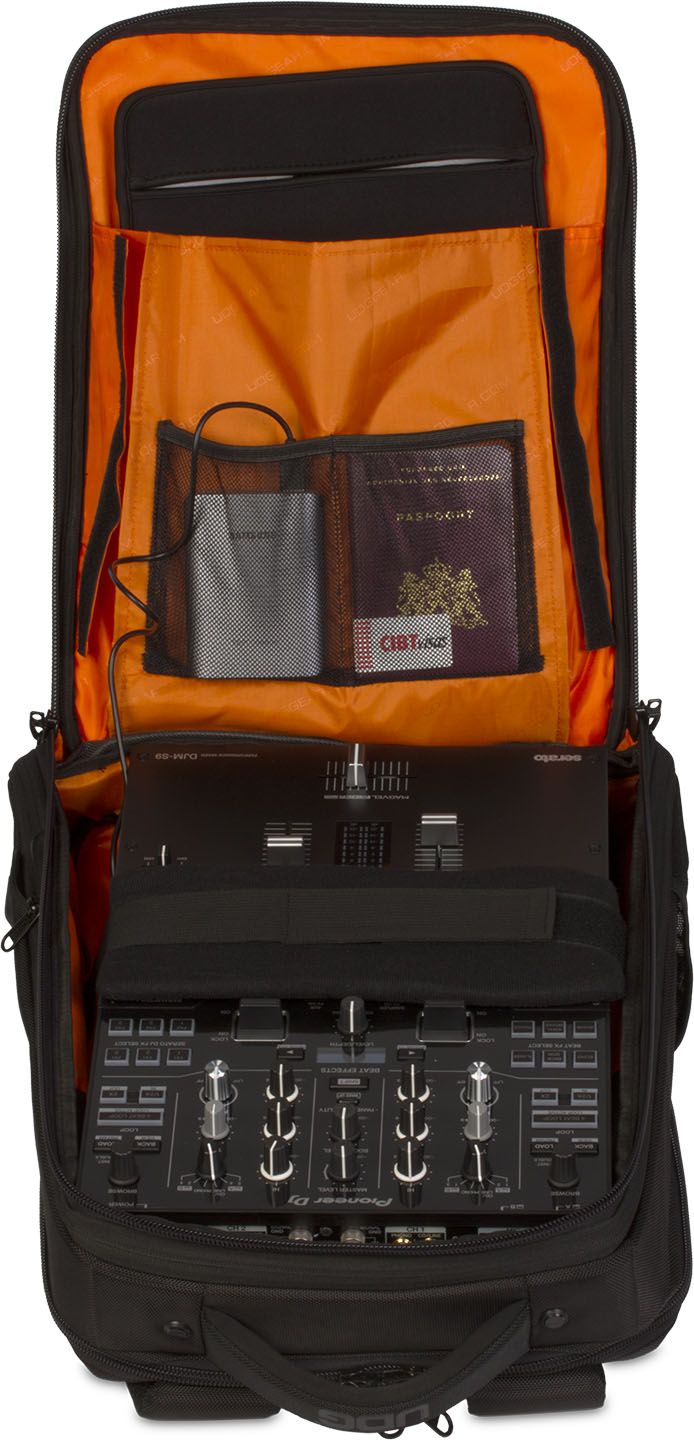 Ultimate Backpack Slim Black/Orange Vadderad ryggsäck av vattenresistent nylon som passar Numark PT01 Scratch portabel vinylspelare, Pioneer DJM-S9/ S3/ 450 mixer. Svart på utsidan och orange på insidan. The UDG Ultimate Backpack Slim is a light weight, slim fit backpack for DJ’s that require a smaller version of UDG’s larger size backpacks. Constructed from high quality water resistant Nylon it contains a padded 17” laptop compartment with added neoprene iPad/tablet pocket. The zipper expandable main padded compartment can hold a Numark PT01 Scratch portable turntable or Pioneer DJM-S9 mixer and a few 7" & 12” tone control/scratch vinyl and some clothing. There are enough zipped compartments to securely store microphone, USB sticks, SD cards, wires, cables and faders, AC power adapters and other accessories. This bag comes with a built in outside USB charger connector, a quick access headphone pocket, ergonomic back padding, comfortable moisture absorbent shoulder straps and a sling so you can slide it on every UDG trolley.