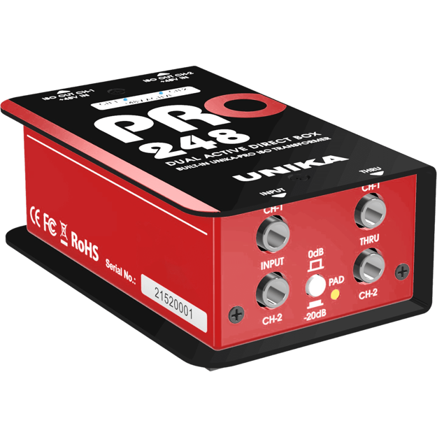 UNiKA PRO-248 is a professional Active two-channel DI box designed to match electric and electro-acoustic guitars, basses, effects pedals and other high impedance sources to the balanced microphone inputs of a mixing console or external mic preamp. As PRO-248 uses the mic preamp's 48V phantom power, no batteries or other power supplies are required.