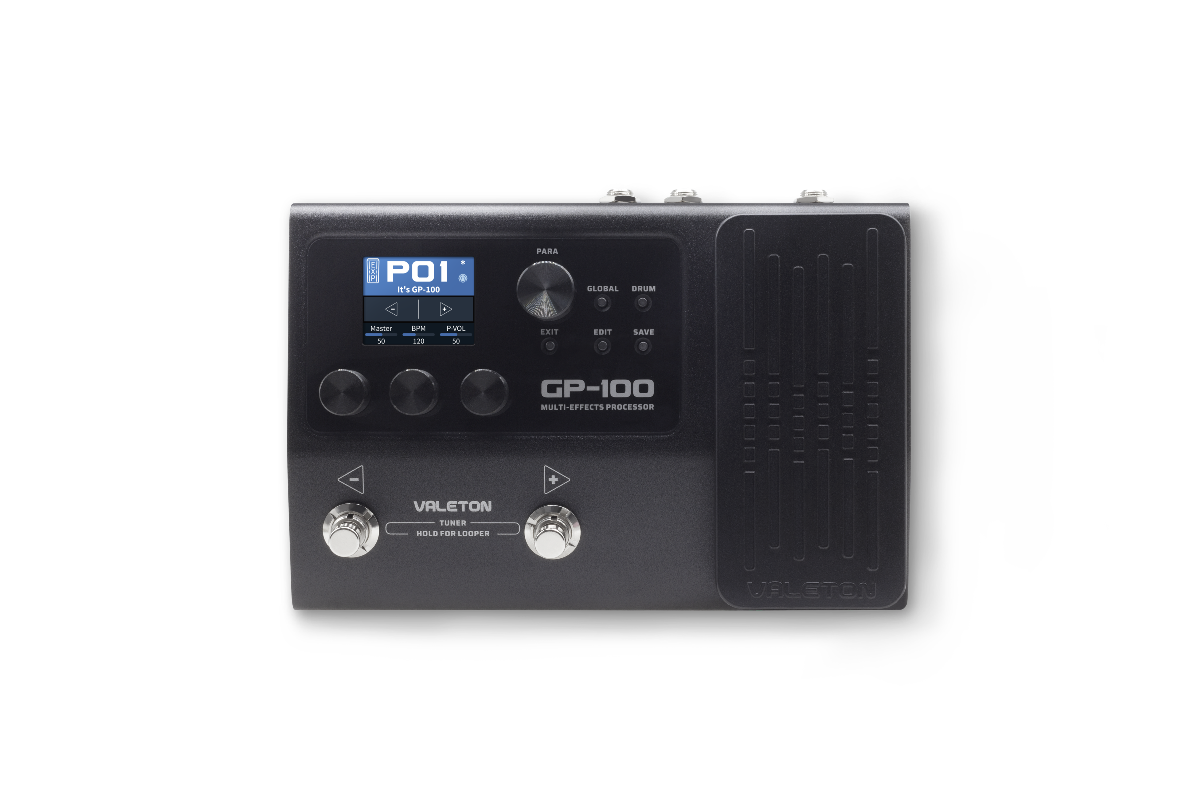 GP-100 er utstyrt med stor LCD-fargeskjerm som gir tydelig oversikt over signalveien og parameterinnstillinger. Den integrerte volum/ekspresjonspedalen kan brukes til volum, wah eller styring av effektparametere. To fotbrytere gir enkel navigering mellom presets og funksjoner under spilling.