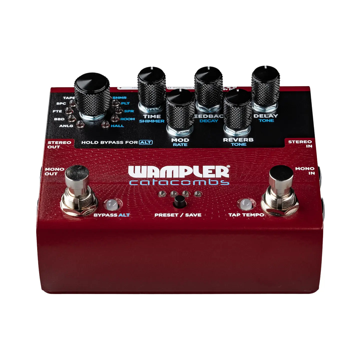 I denne multieffekten har Brian Wampler samlet de mest ikoniske og populære typene Reverb- og Delay-effekter. Catacombs tilbyr studiolydkvalitet med en samplerate på 48 kHz, samt full MIDI-styring i tillegg til vanlige Tele inn- og utganger.
