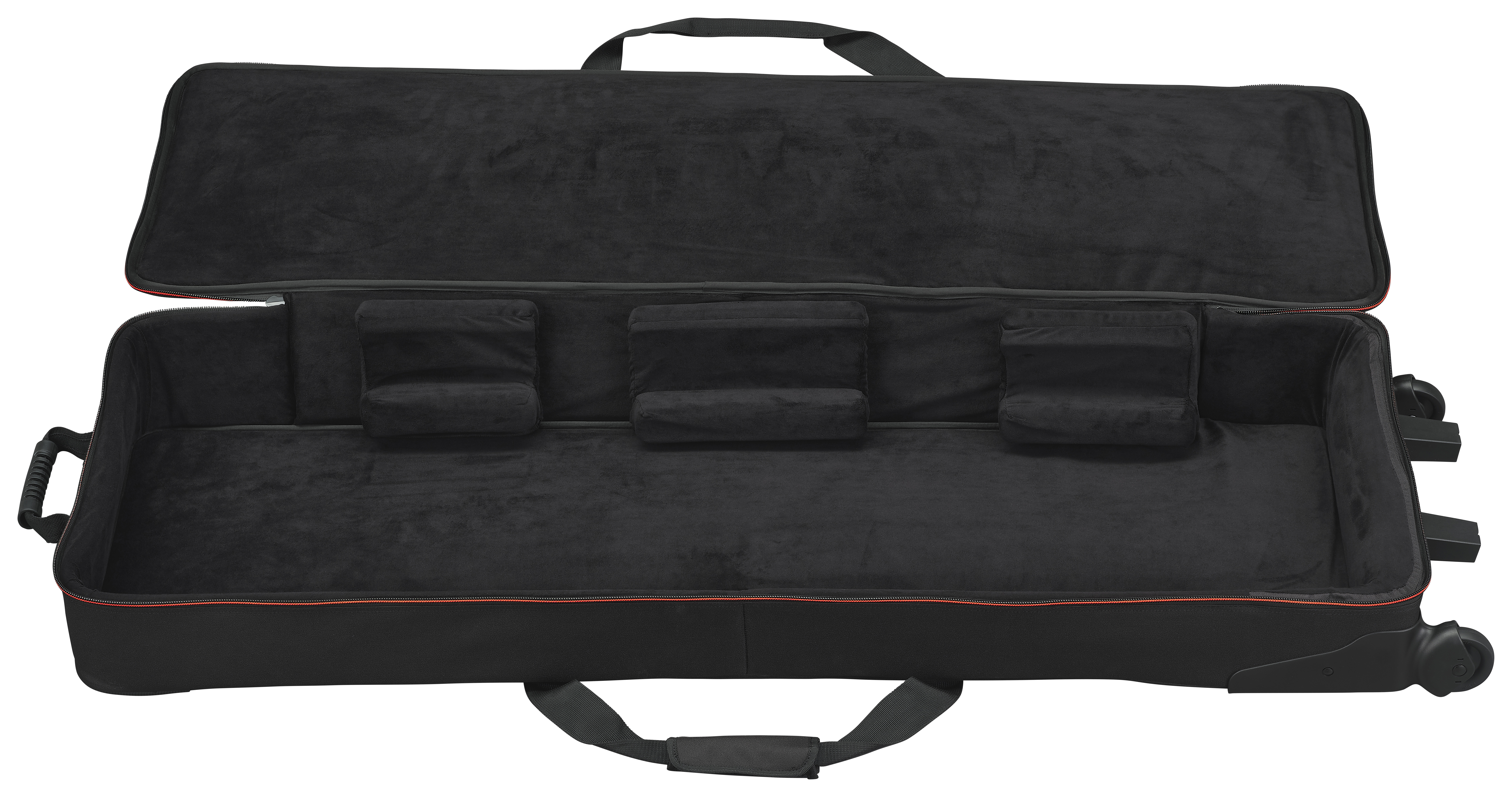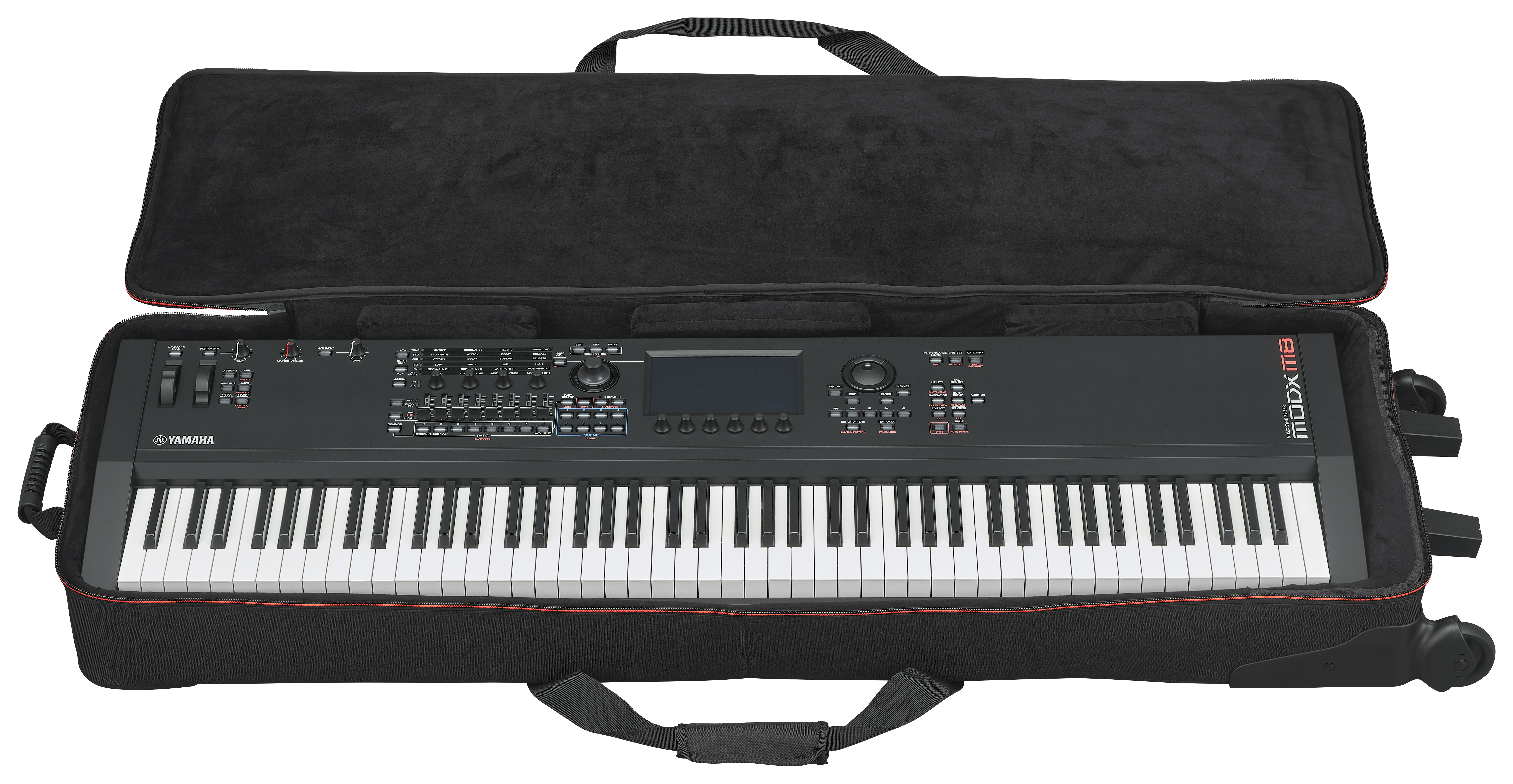 Softcasen er utstyrt med to ytterlommer for oppbevaring av pedaler, strømadaptere, kabler og noter. Den store bærestroppen og håndtaket på toppen gjør det enkelt å dra casen, mens håndtaket på baksiden gir fleksibel transport. SC-MODX M8 har også to hjul og to støtteføtter som gjør det praktisk å flytte synthen over lengre avstander.