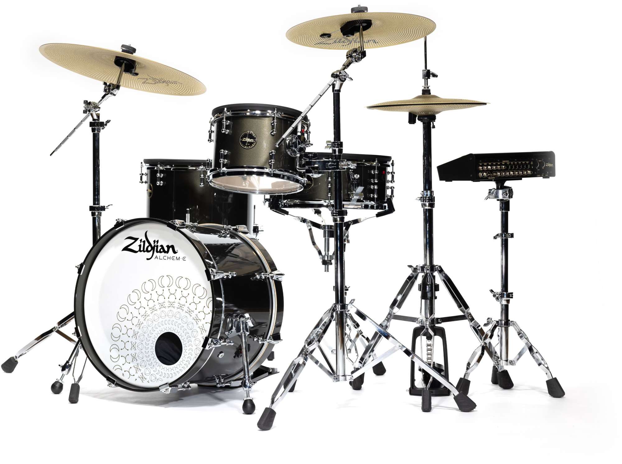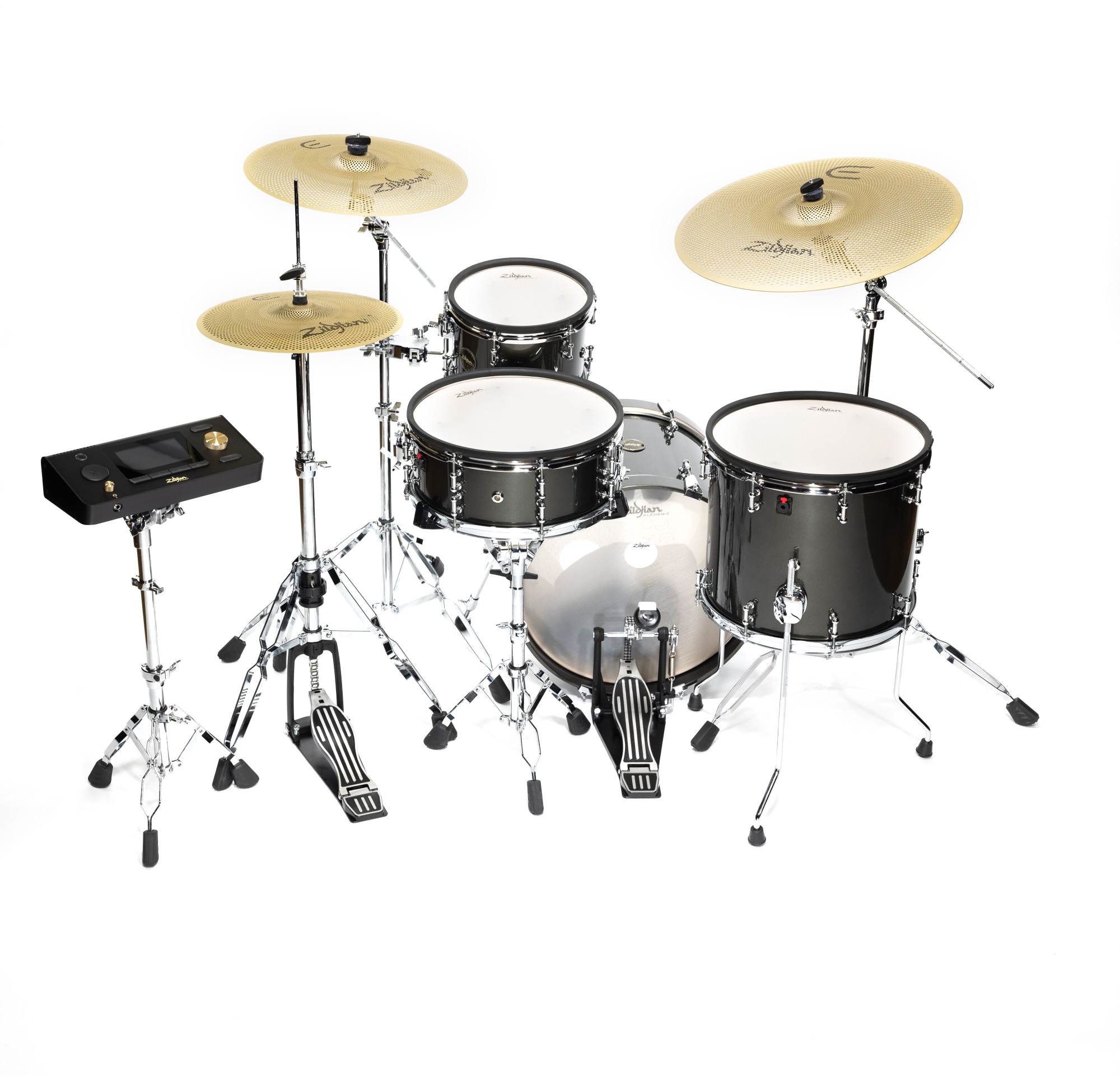 - Revolusjonerende E-FAMILIE Cymbaler: 14" HiHats, 16" Crash, 20" Ride. Alle har innebygd Zildjian™ Trigger System, 3-soners spillbarhet og 360° berørings-"choke"