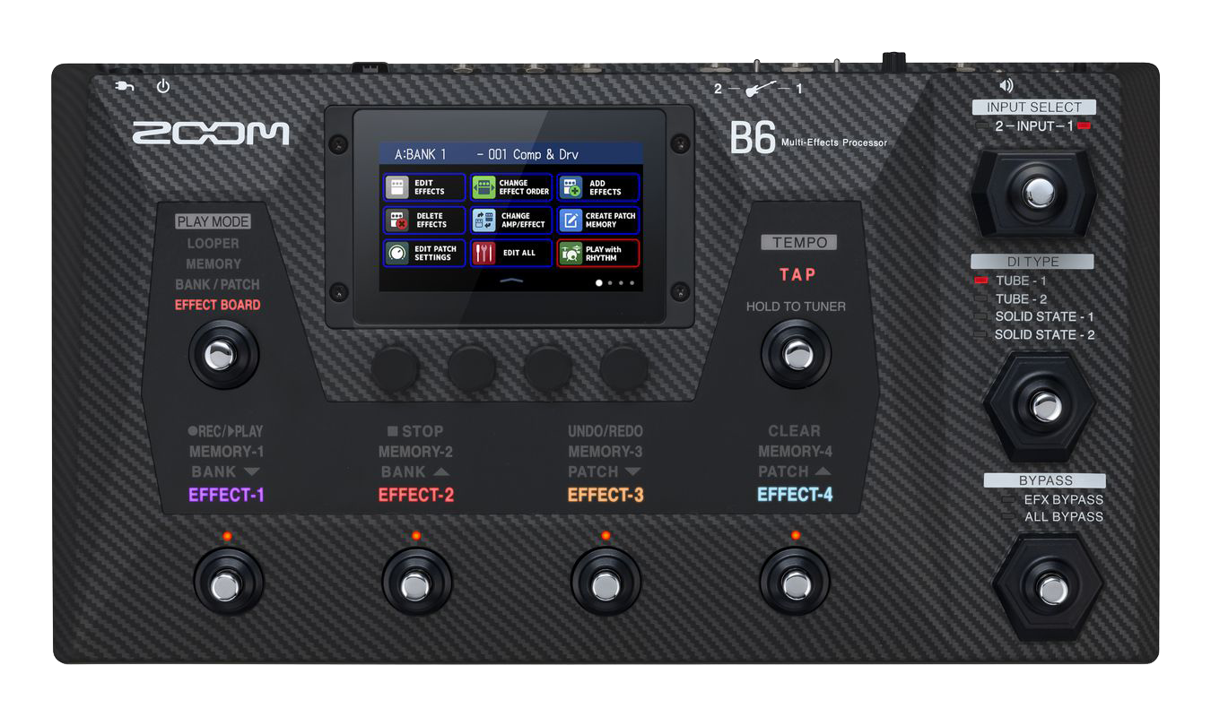 En stor 4,3" farge LCD-berøringsskjerm gir intuitiv navigasjon, mens det integrerte pedalbrettet med ni fotbrytere gjør det enkelt å bytte mellom lyder og moduser i sanntid. Separate innganger med justerbar impedans sikrer optimal lyd for både elektrisk, akustisk og synth-bass, og looper- og opptaksfunksjonen gir kreative muligheter opptil to timer. Med rytmemønstre, forsterkermodellering og trådløs kontroll via tilbehør er B6 et komplett verktøy for bassister på alle nivåer.